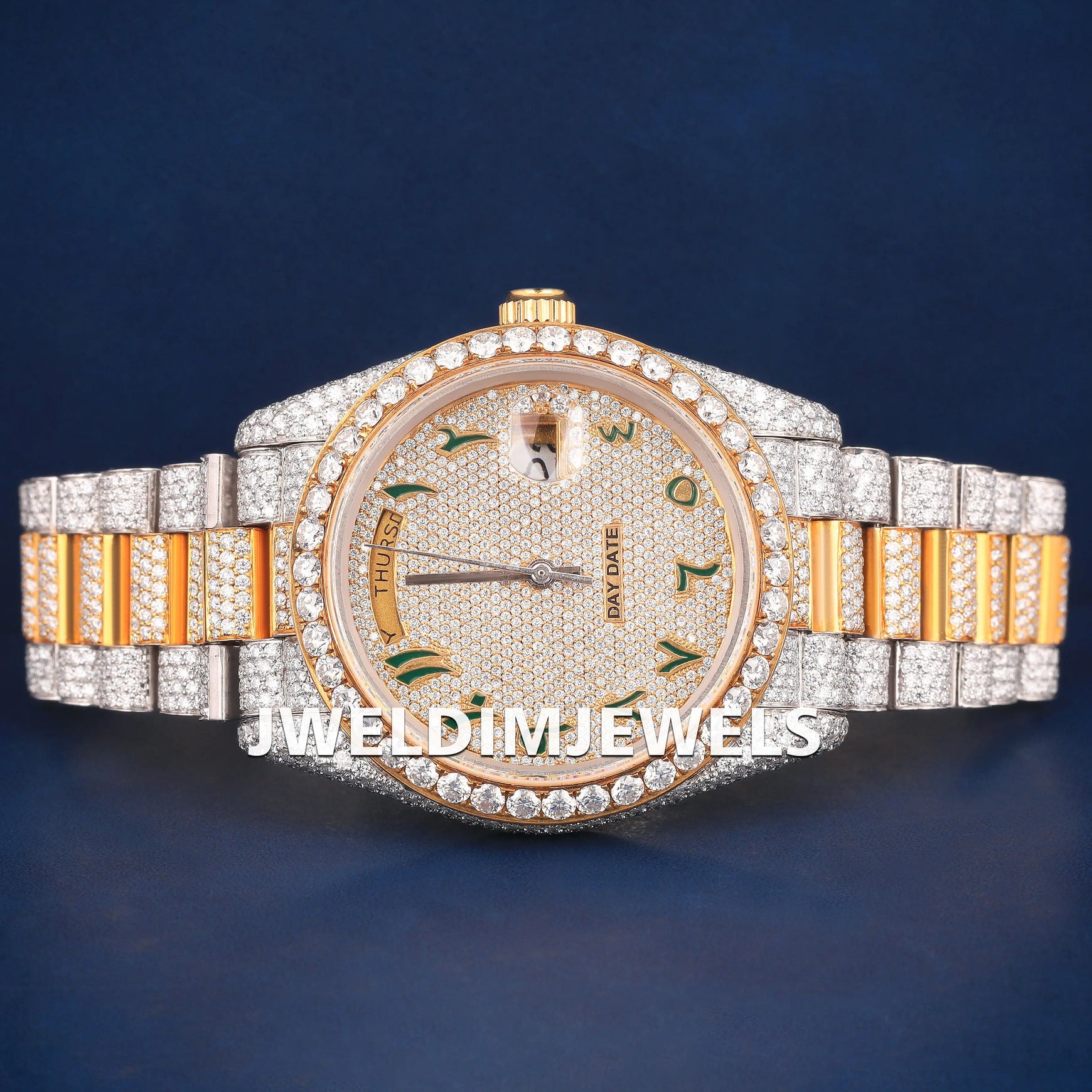 Two tone silver yellow in real bust down watches with green arabic dial iced look