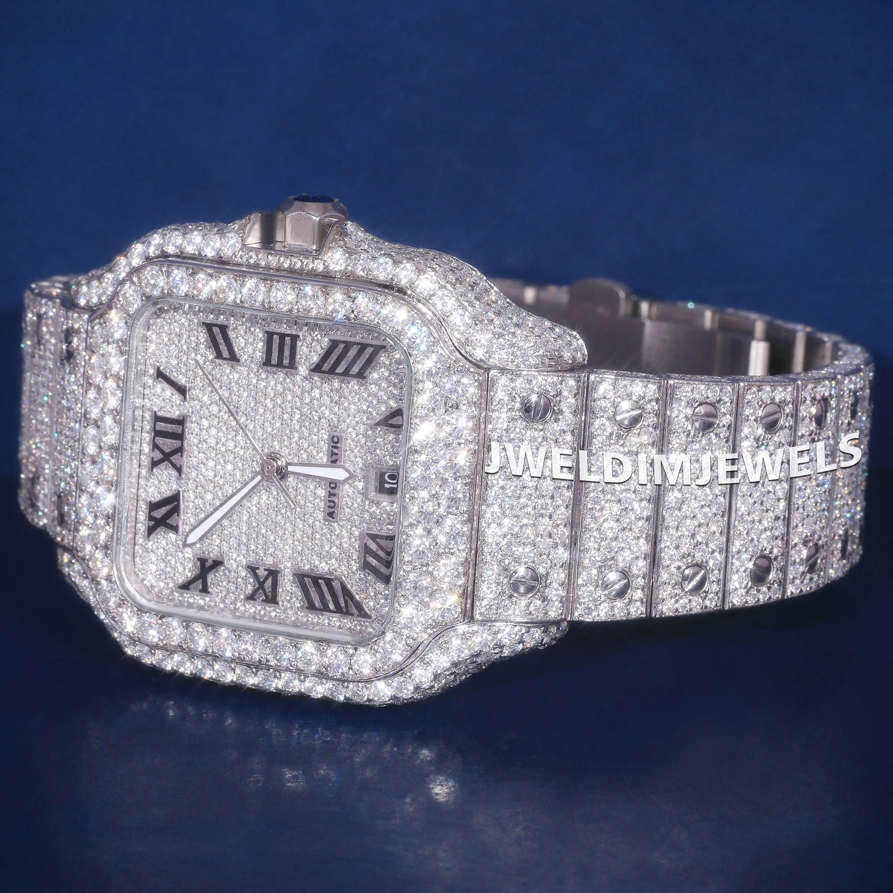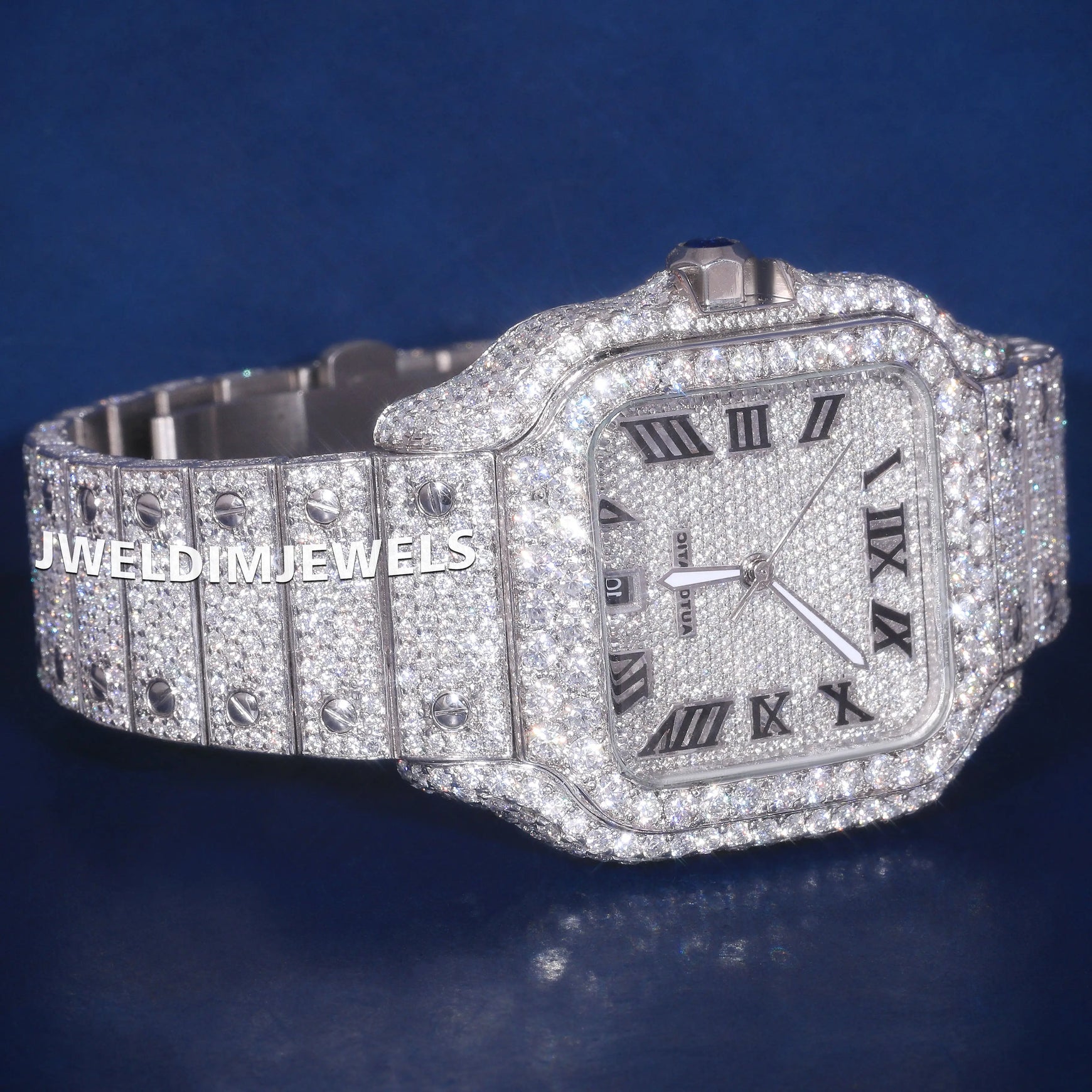 Mens Hip Hop Diamond Watches Roman Dial Fully Iced Out Diamond Silver Custom Watches for Ladies