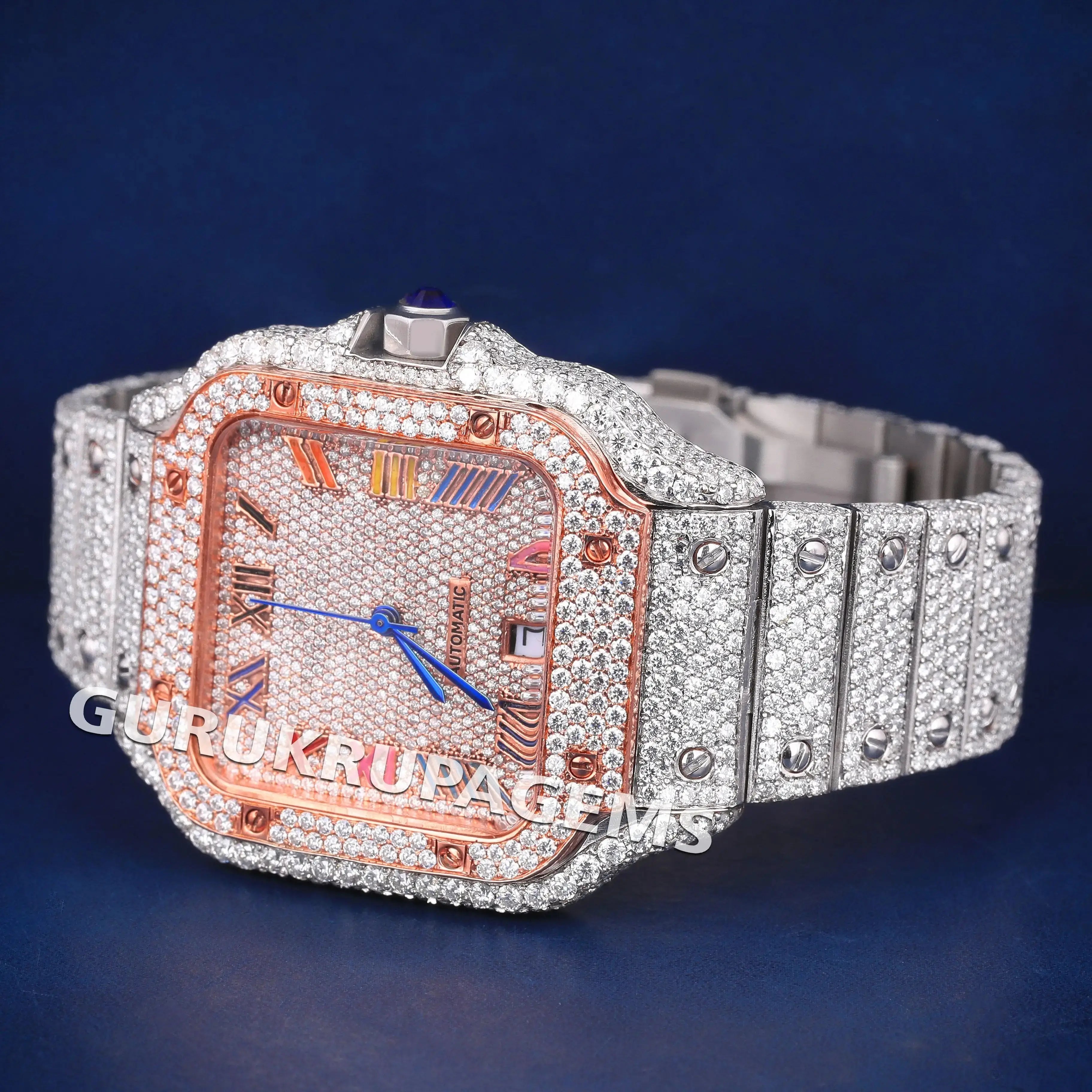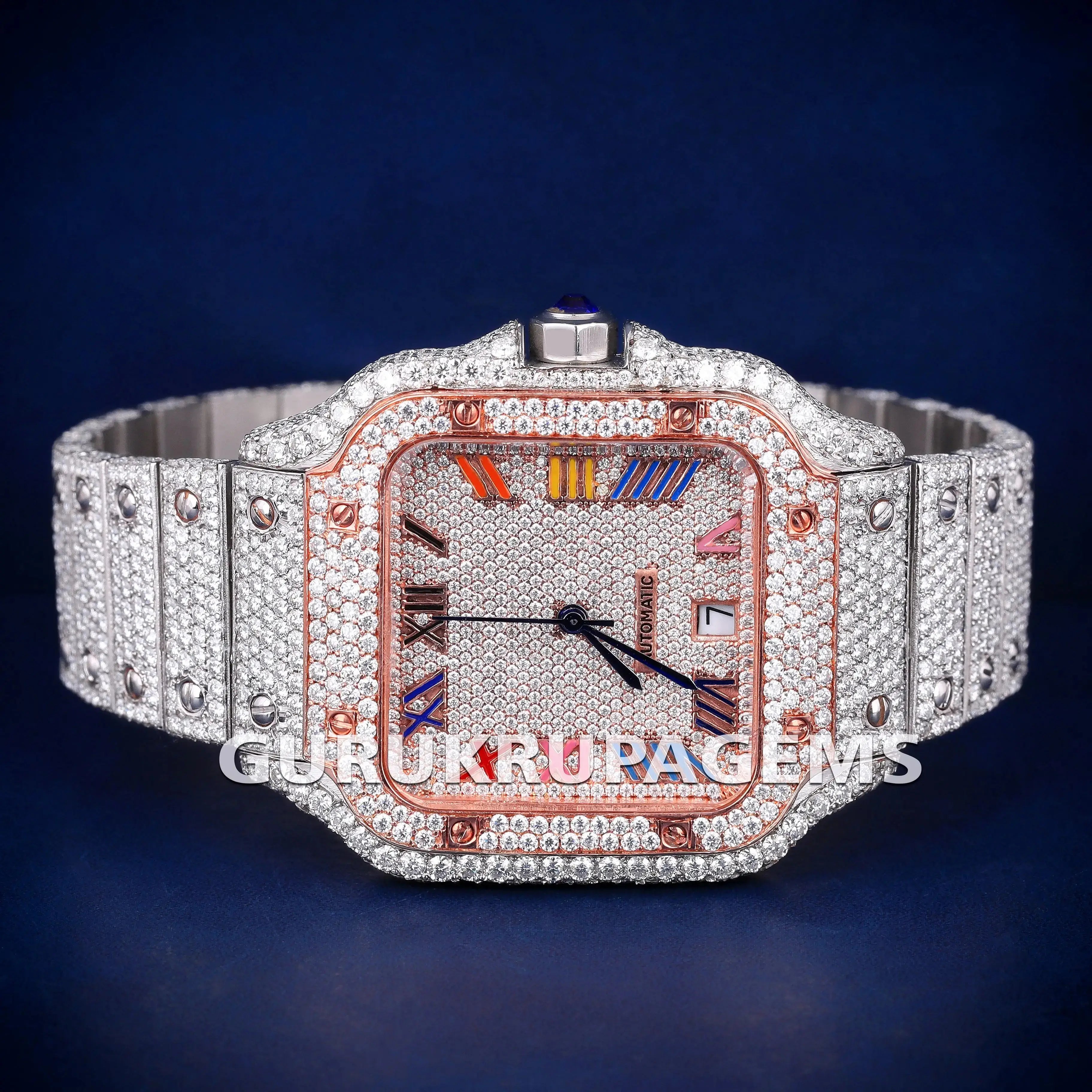 Two tone roman numeral timepiece iced out diamond watch with multicolor dial