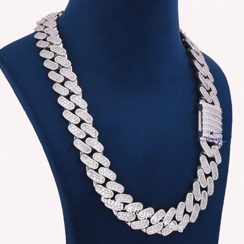 22 Inch 20 mm White Baguette and Round Cut Cuban Chain
