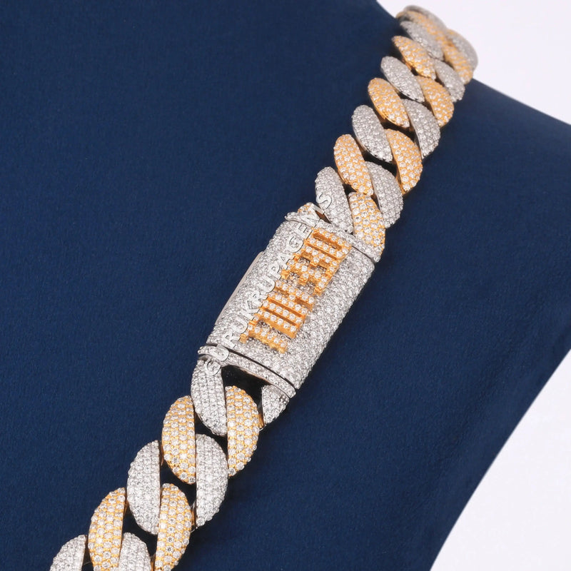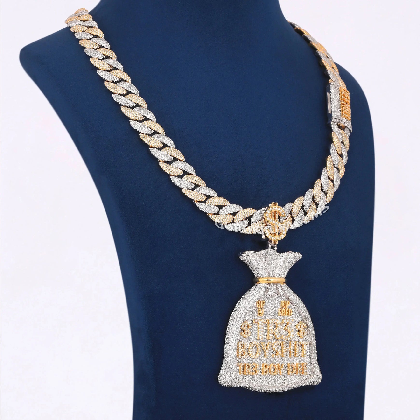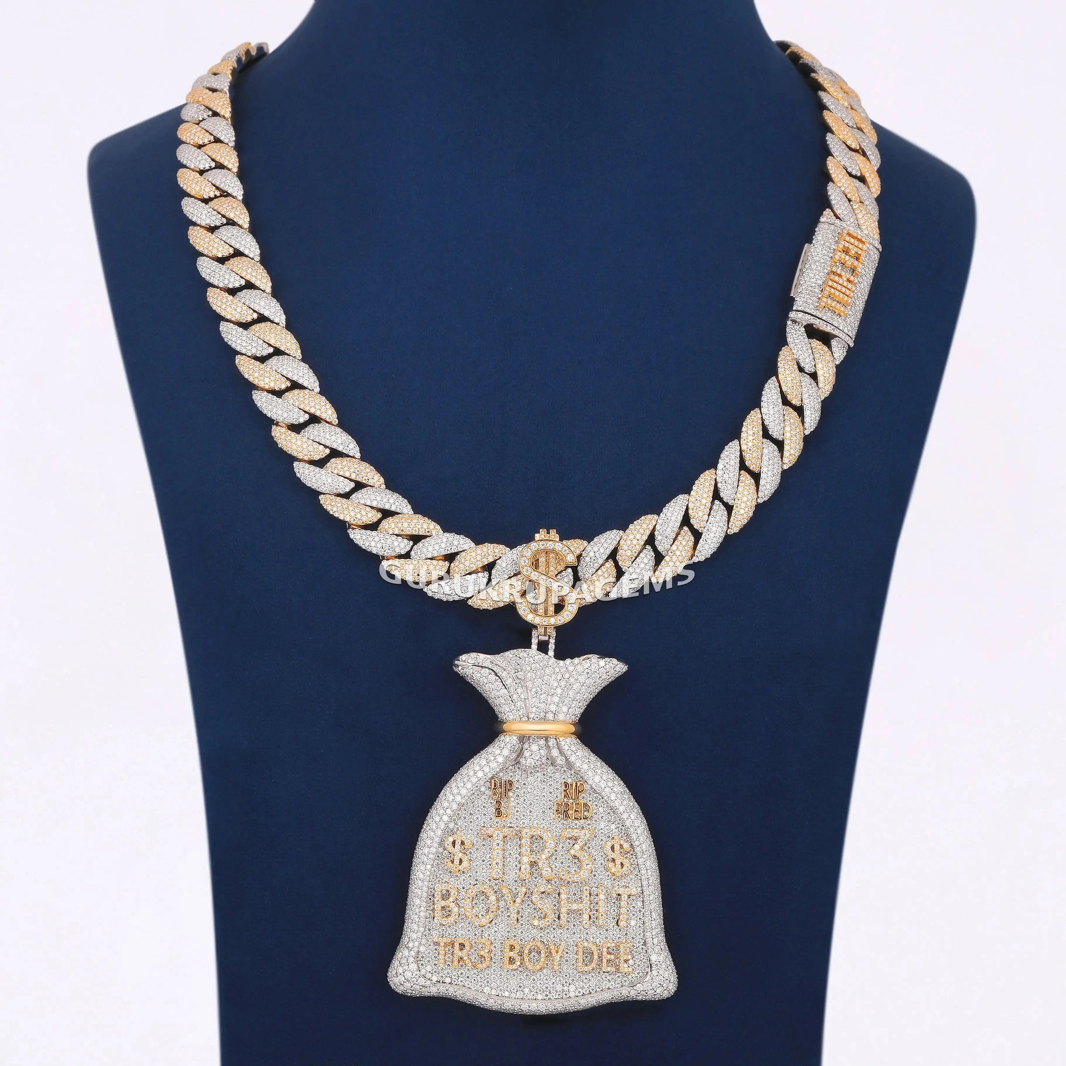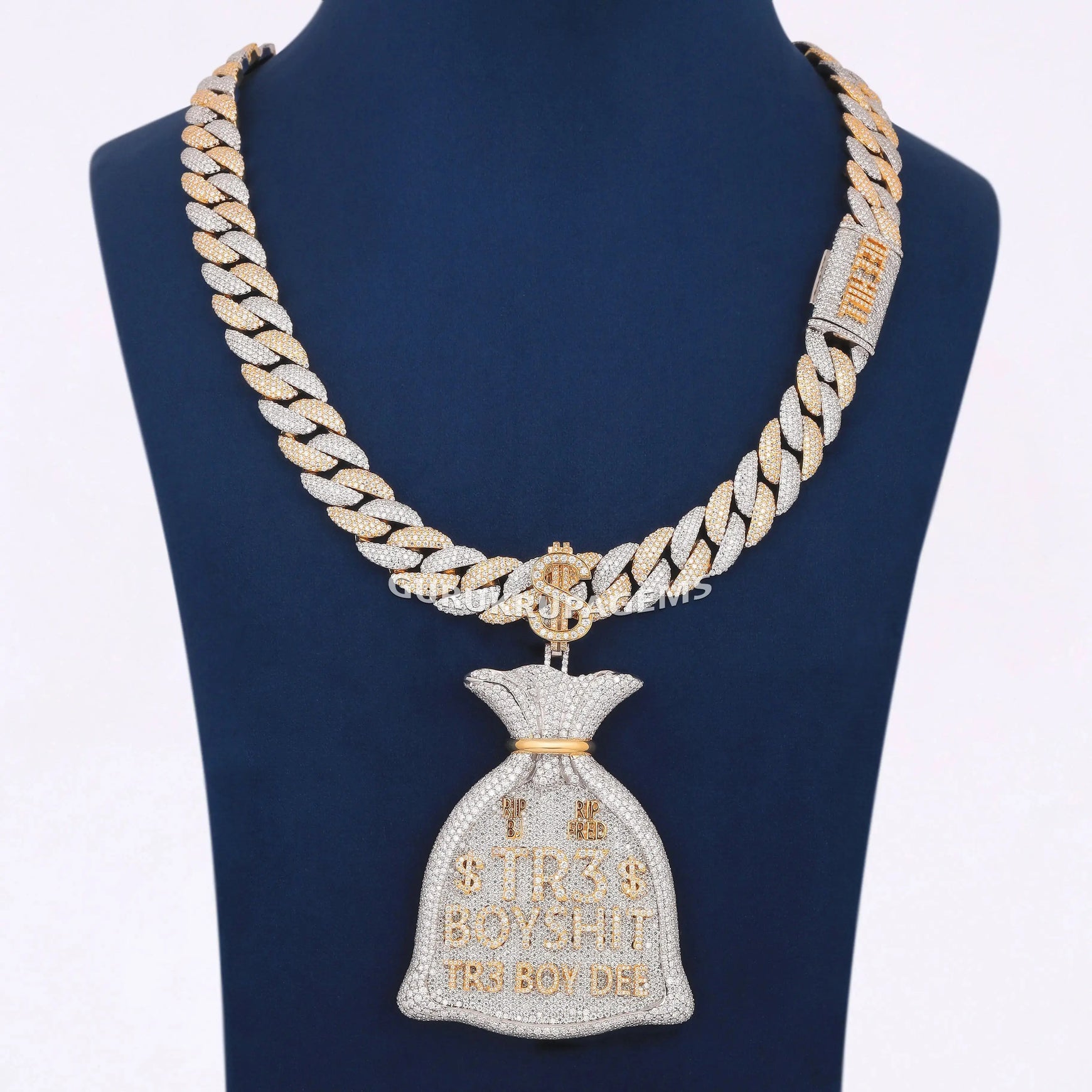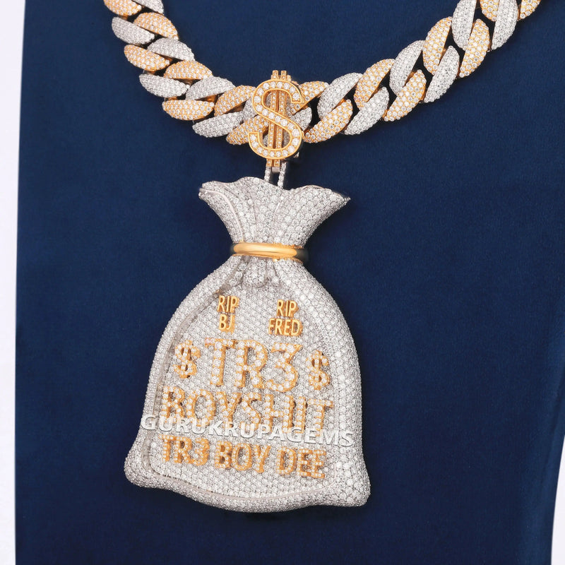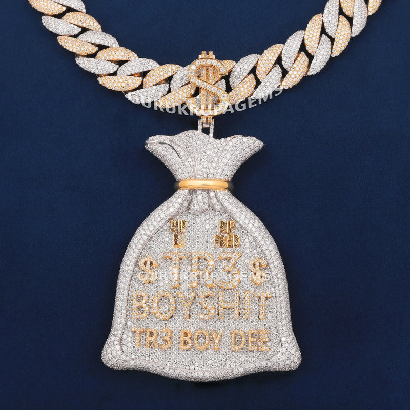 Fully Iced Out 14KT Two Tone Gold & Silver Cuban Link Chain with Exclusive Money Bag Pendant in VVS Clarity Diamonds