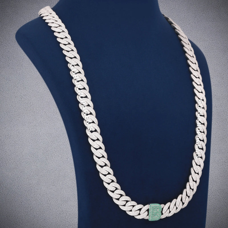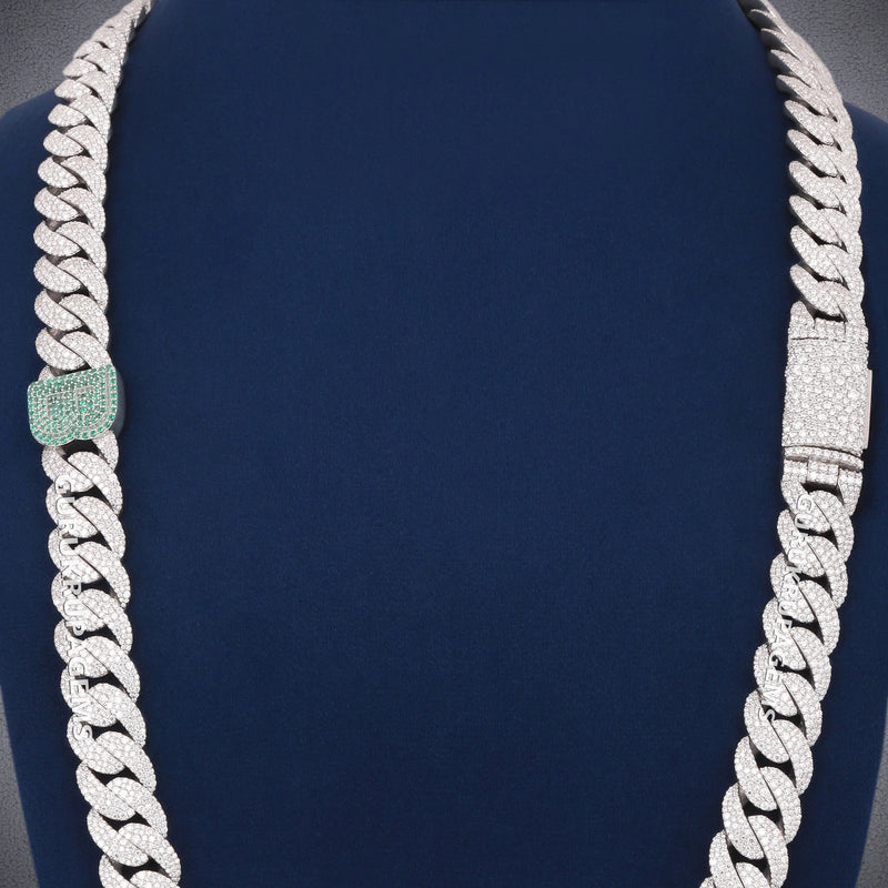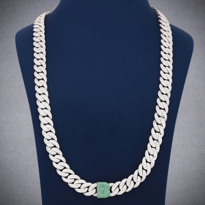 28 Inch 14mm White Gold Miami Cuban Link Chain Fully Iced with Green Diamond Accents