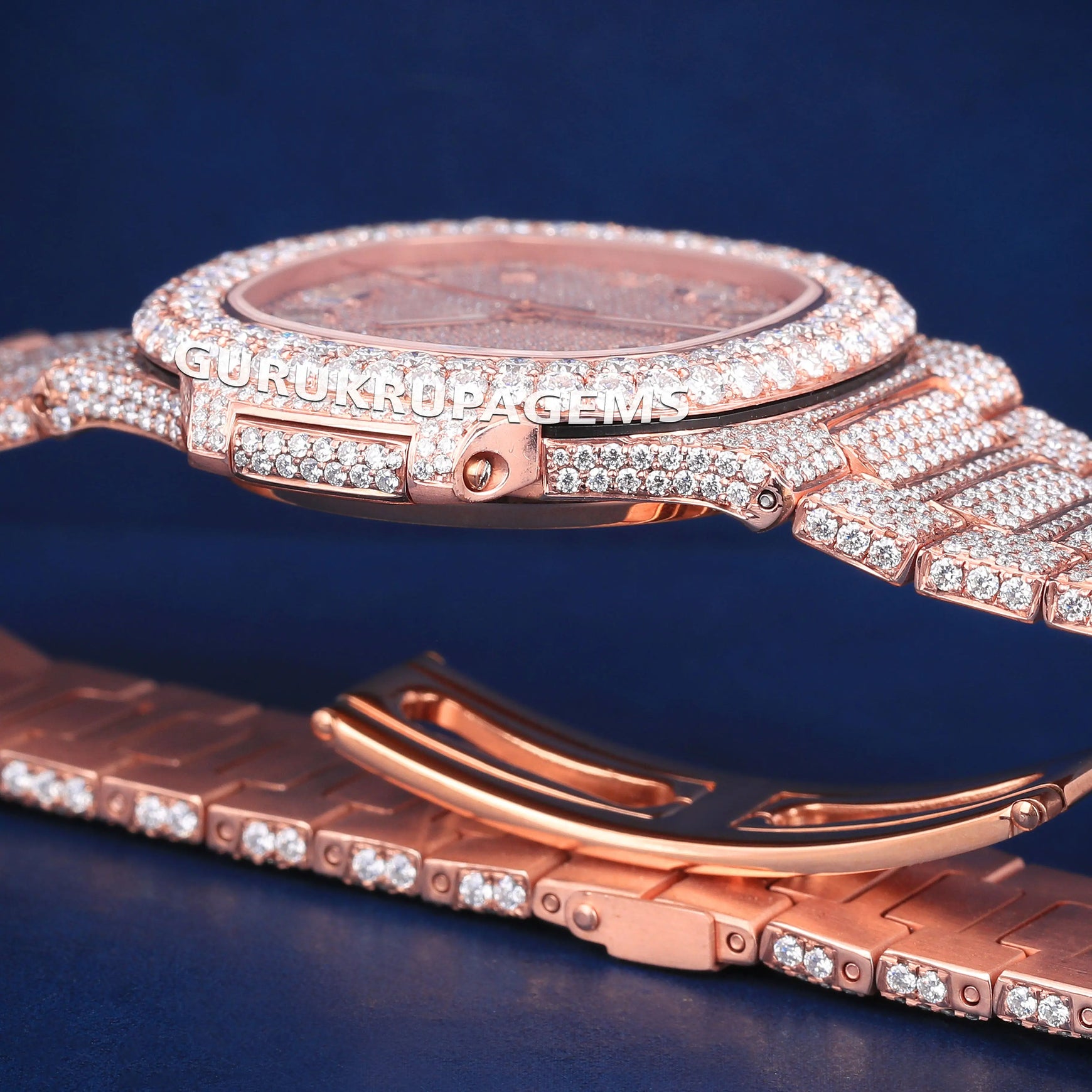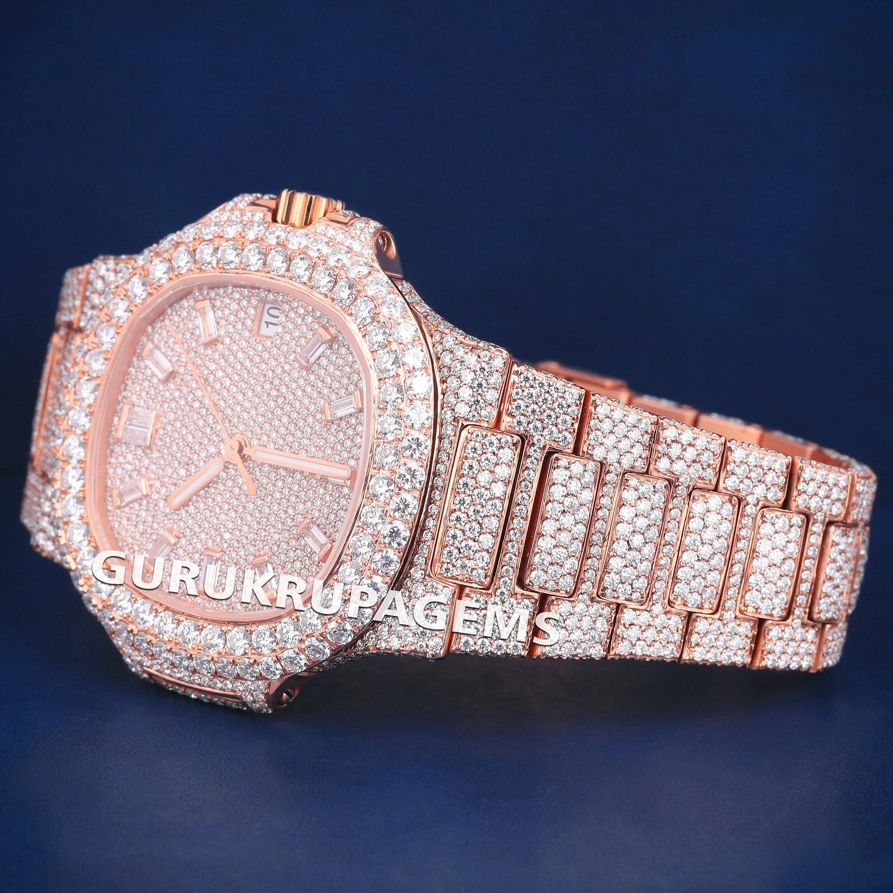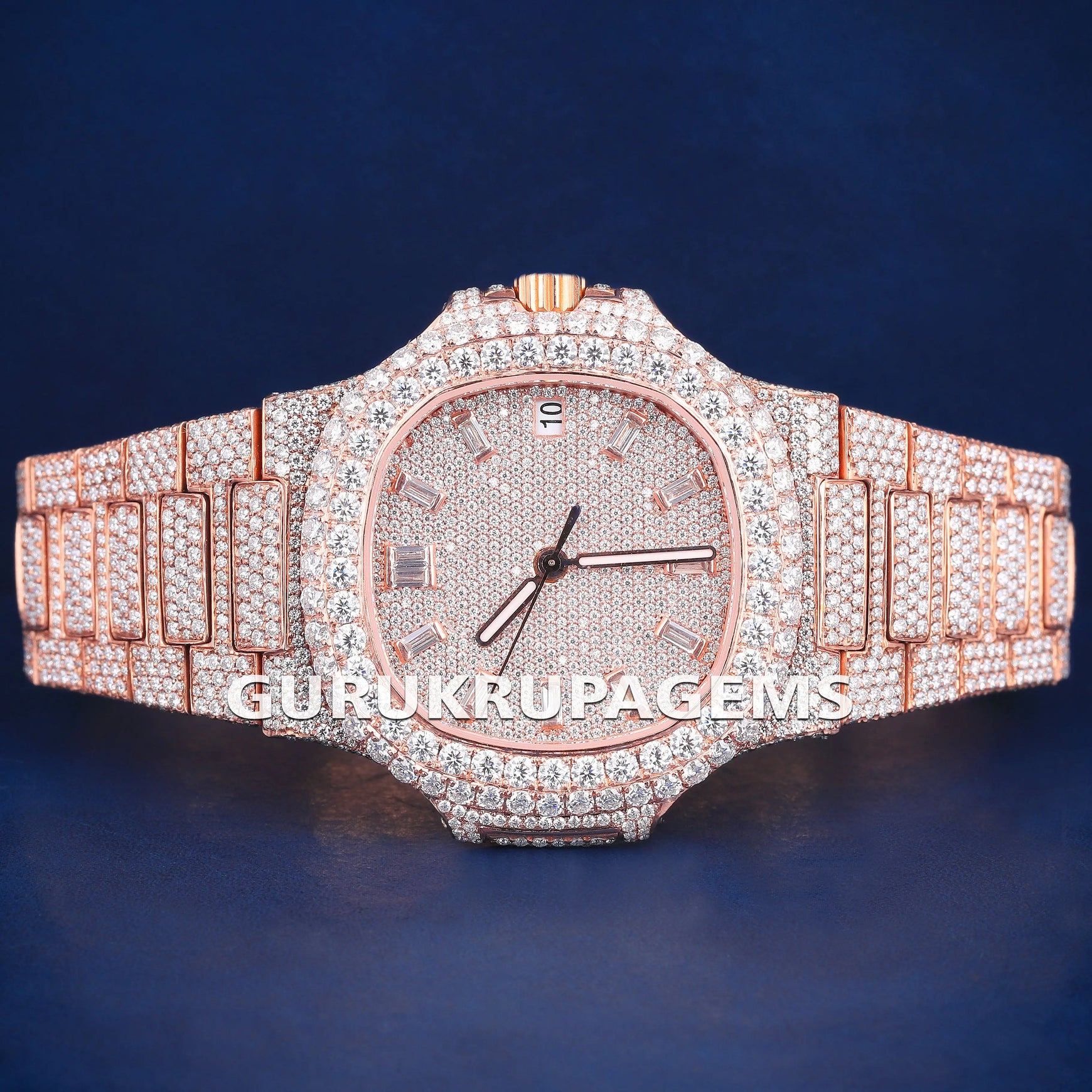 41mm Baguette Diamond Rose Dial Watch Fully Iced Out VVS Moissanite Diamond Watch for Men