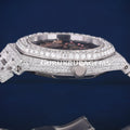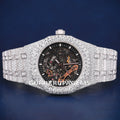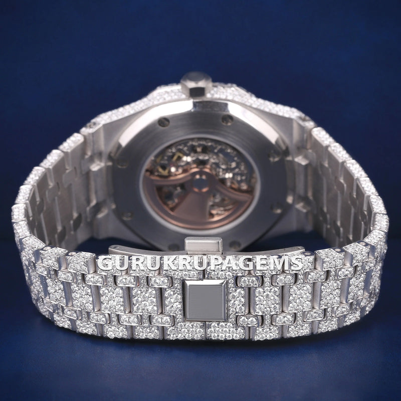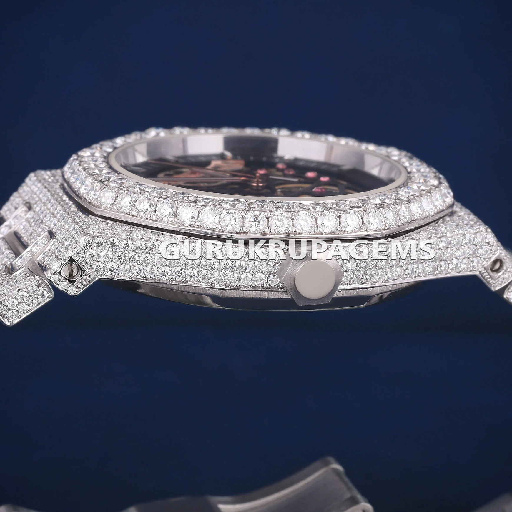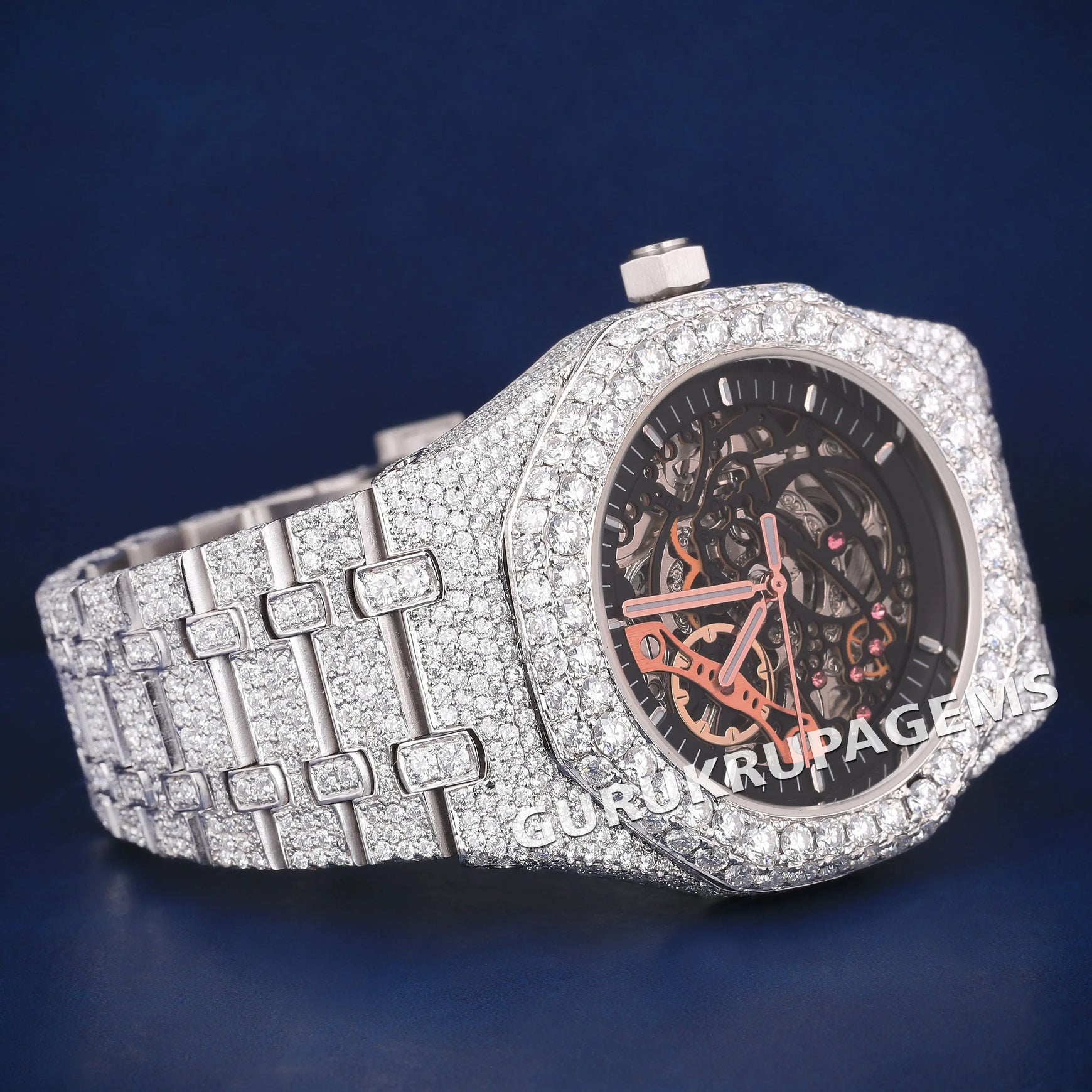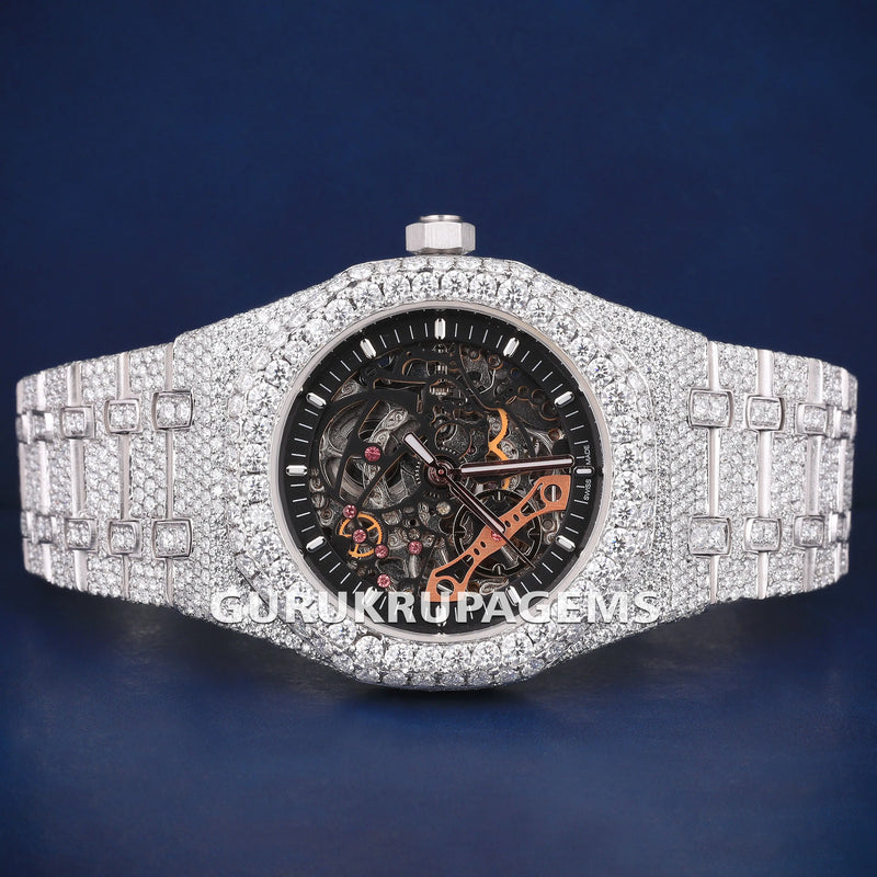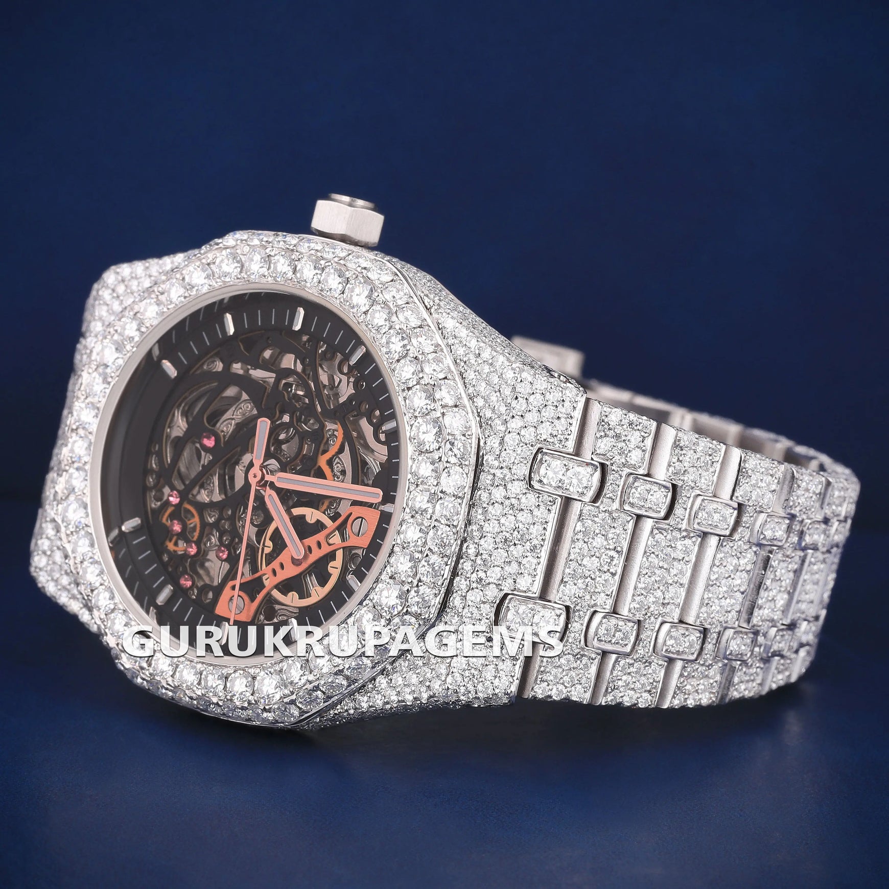 Black skeleton dial watch featuring royal oak fully studded moissanite watch design