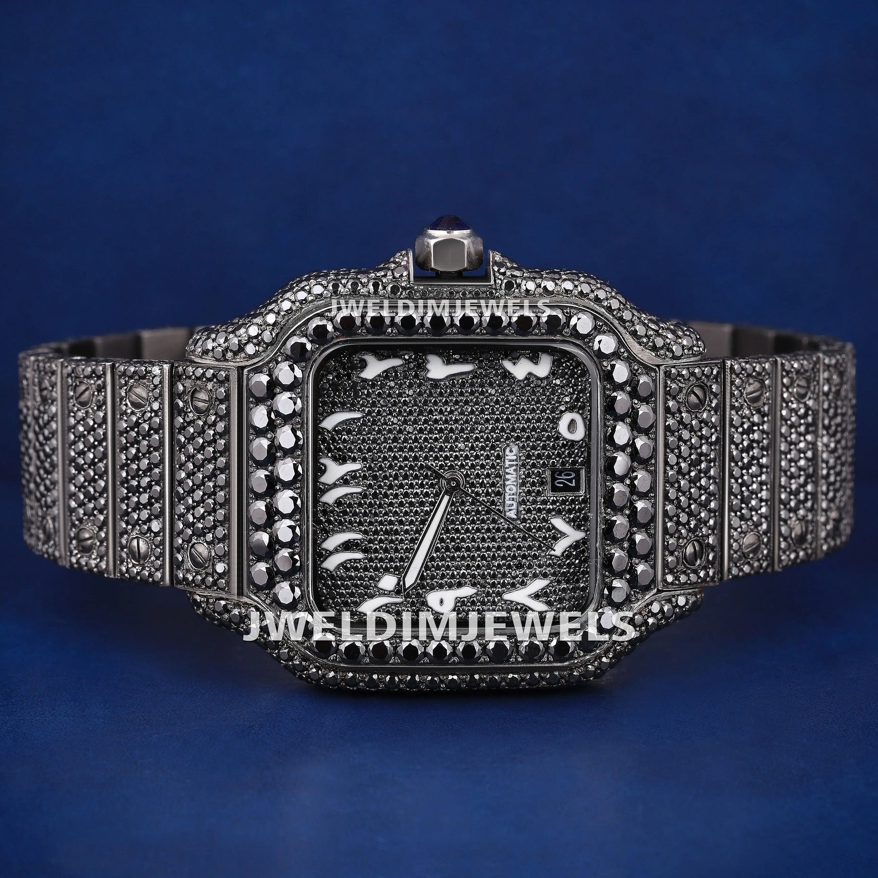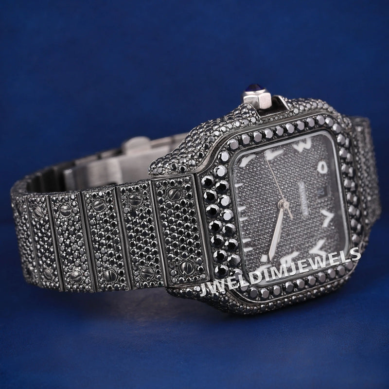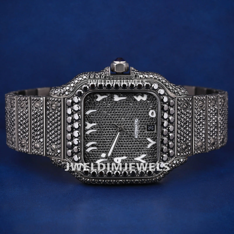 Custom Fully Black Diamond Iced Out Watches with Black Arabic Dial Best Black Luxury Watches for Mens Womens