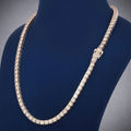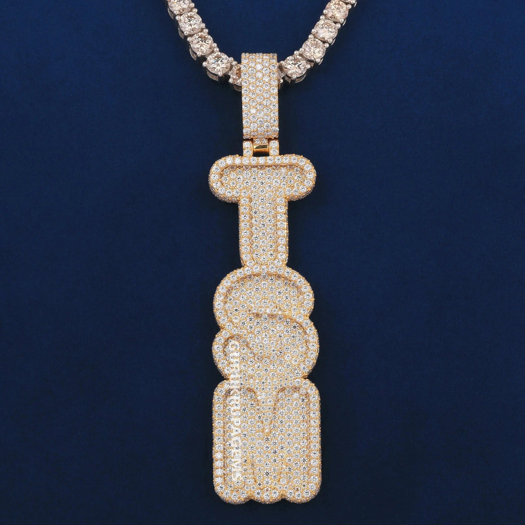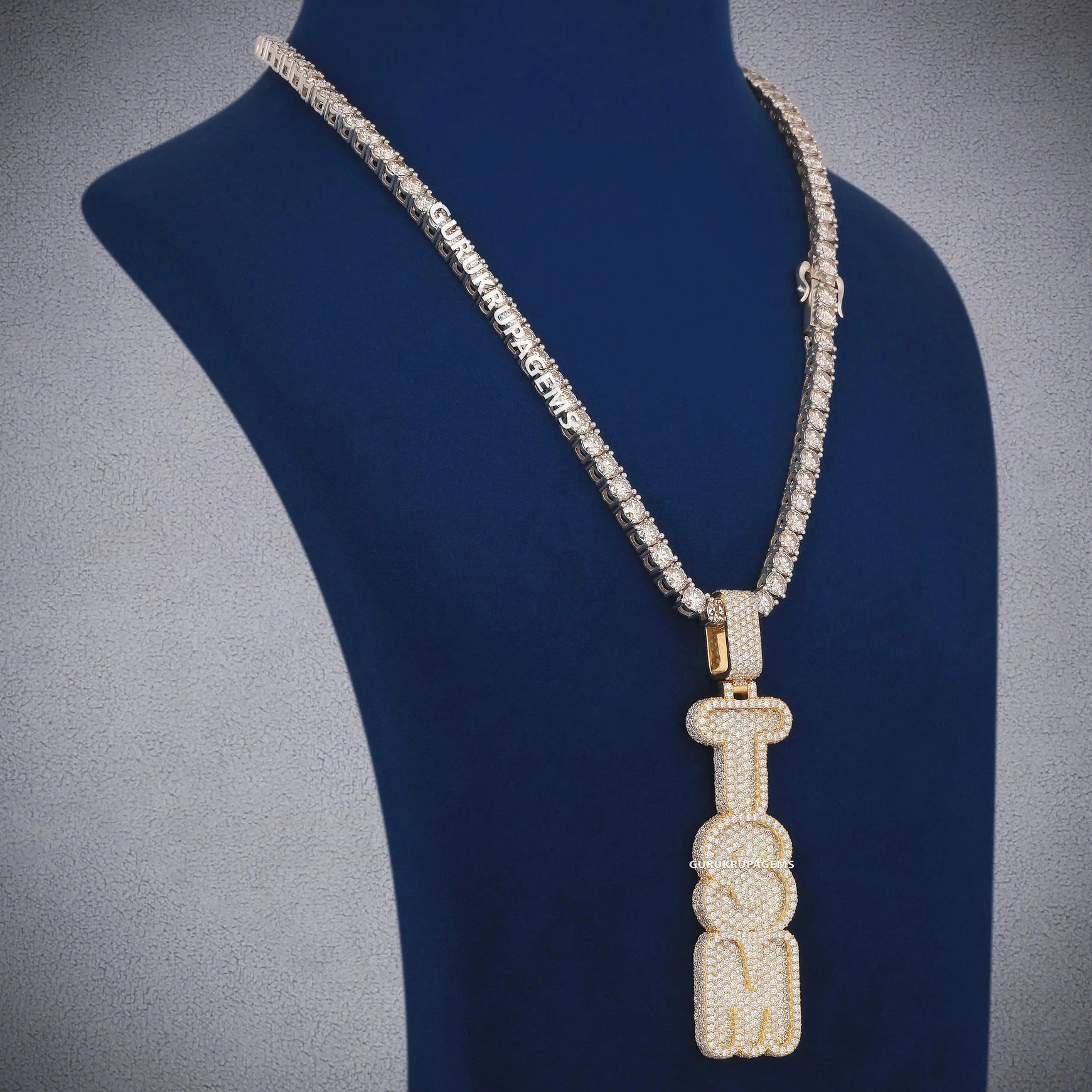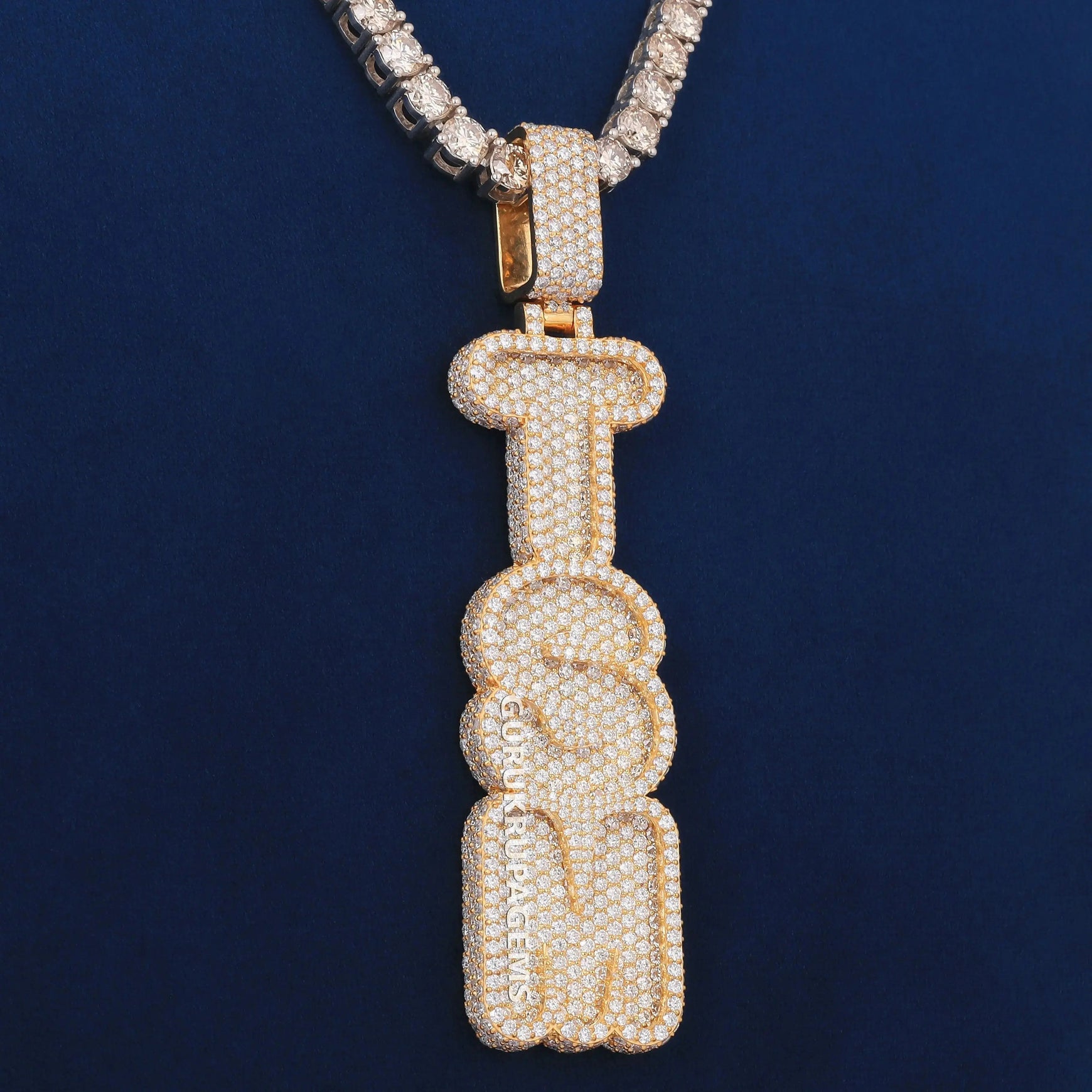 Custom Two Tone Tennis Silver Chain with Yellow Gold Fully Iced Vertical Letter Pendant VVS Diamonds Necklace for Celebrity Inspired Look for Mens