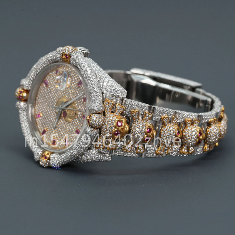 Experience a unique and attractive design with a fully iced out skull moissanite diamond watch