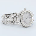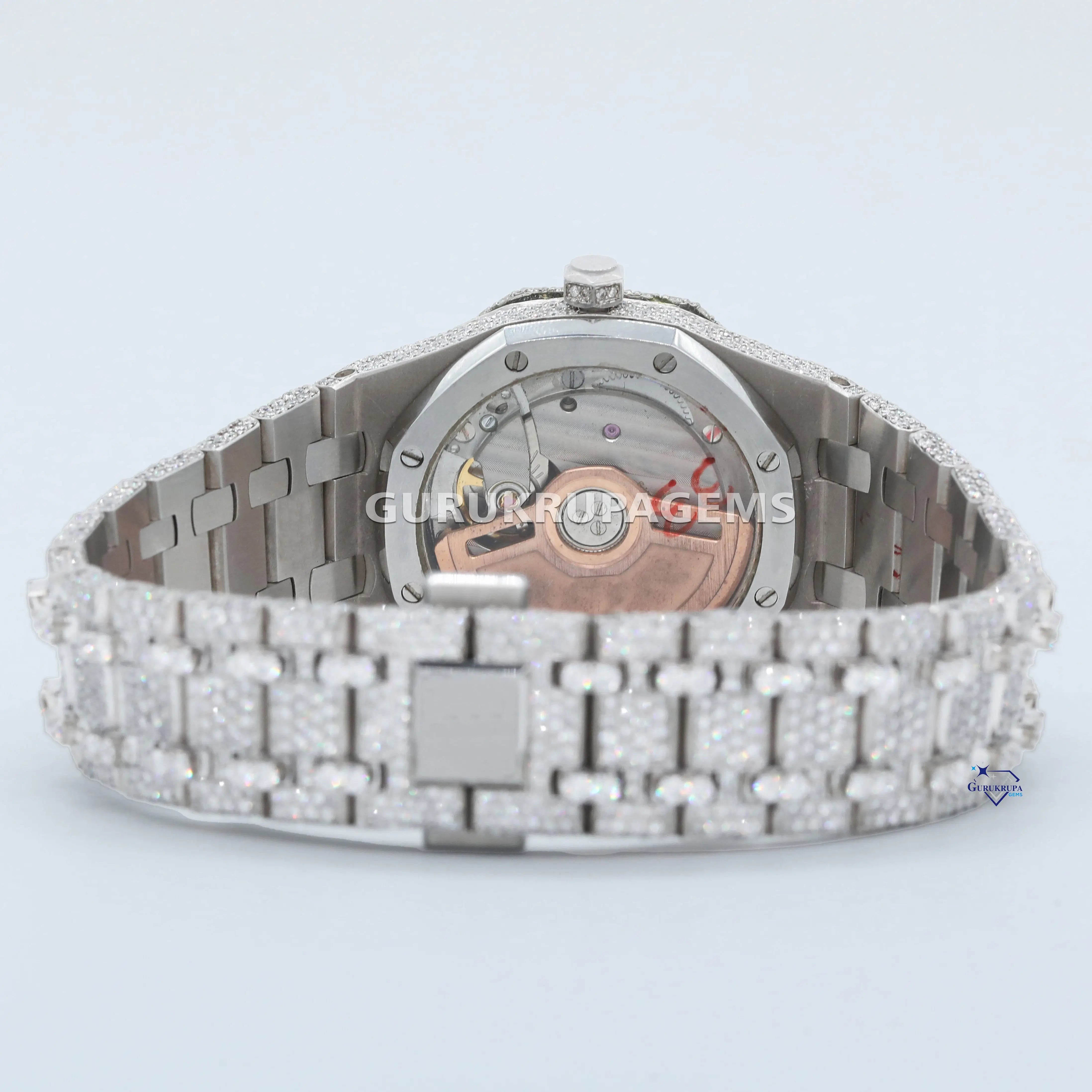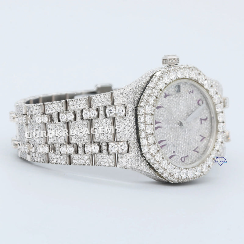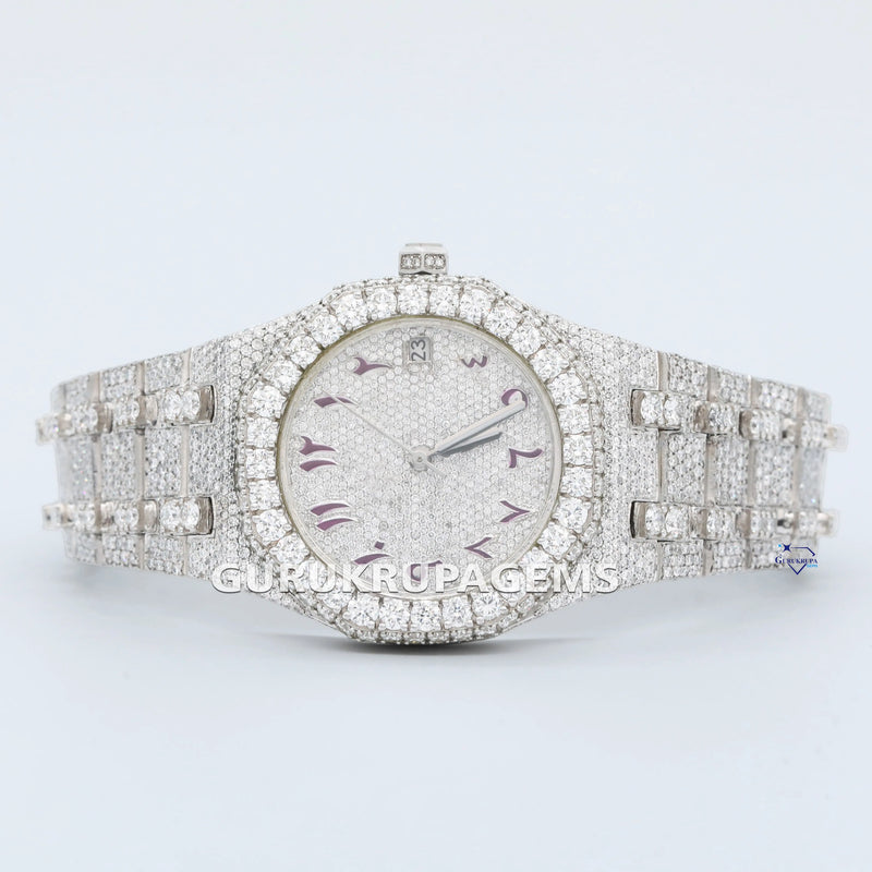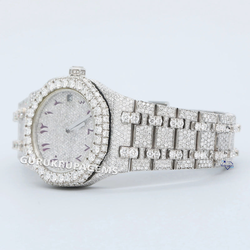 Introducing a stylish mens watch crafted from stainless steel featuring lab-grown diamond with vibrant purple Arabic numerals