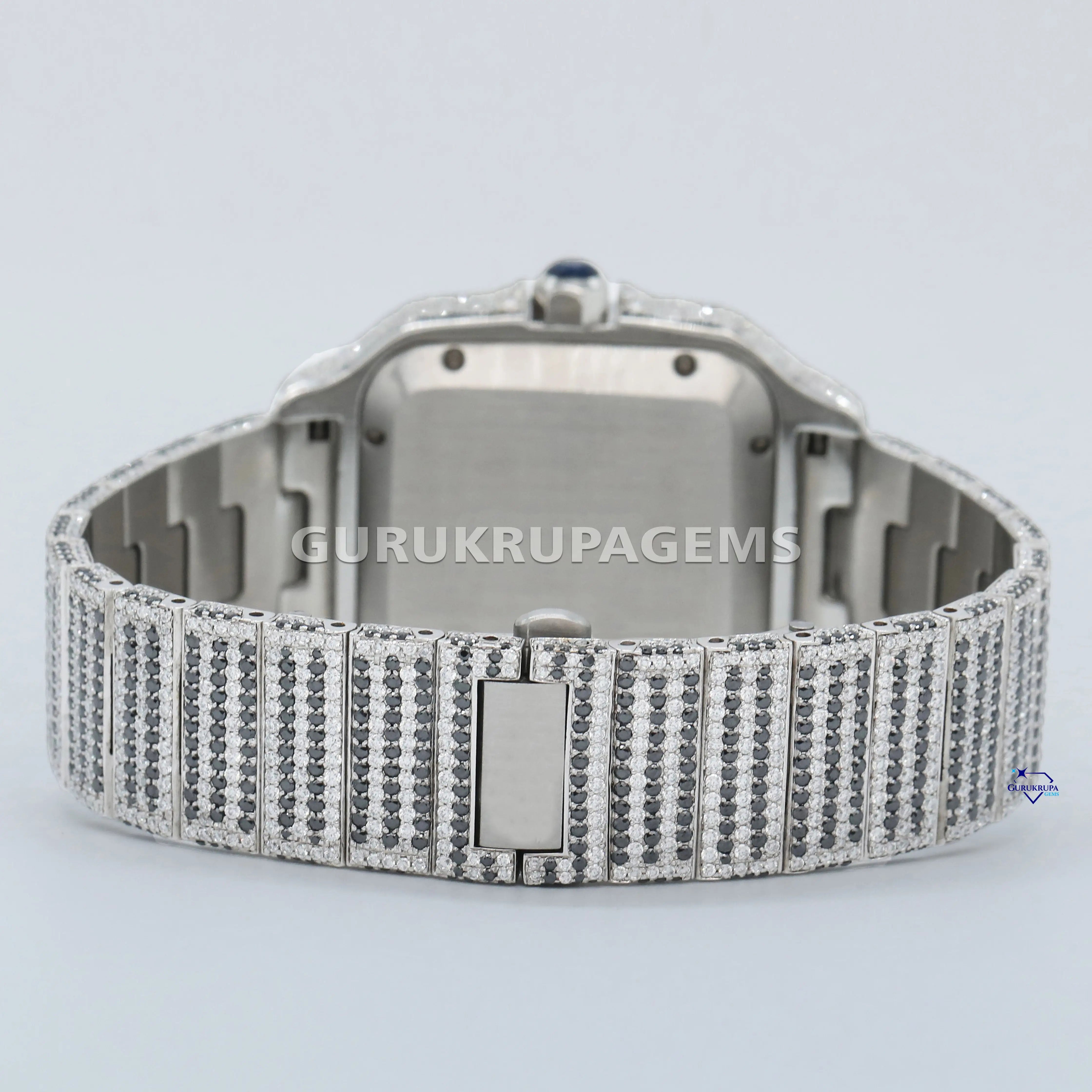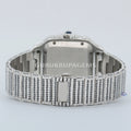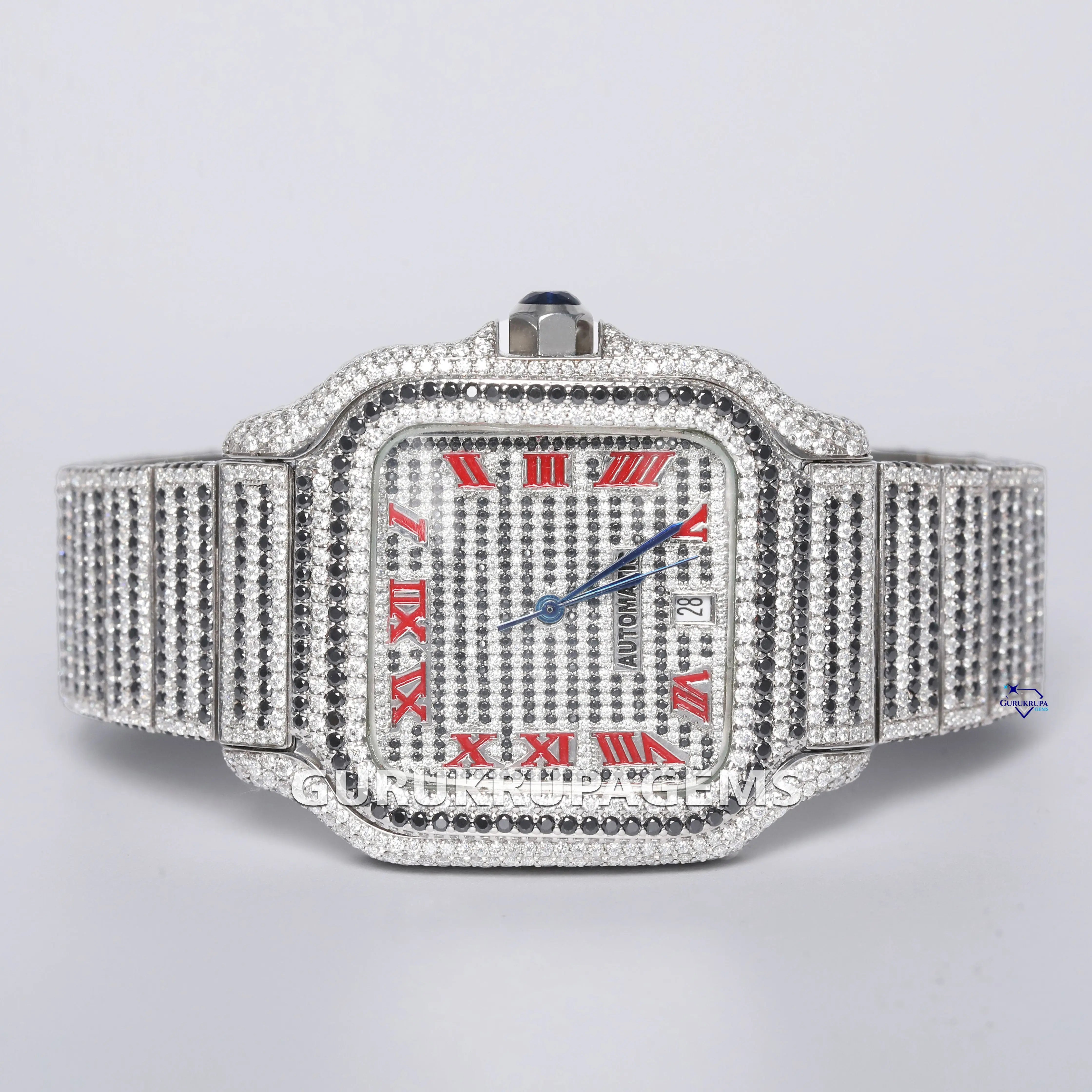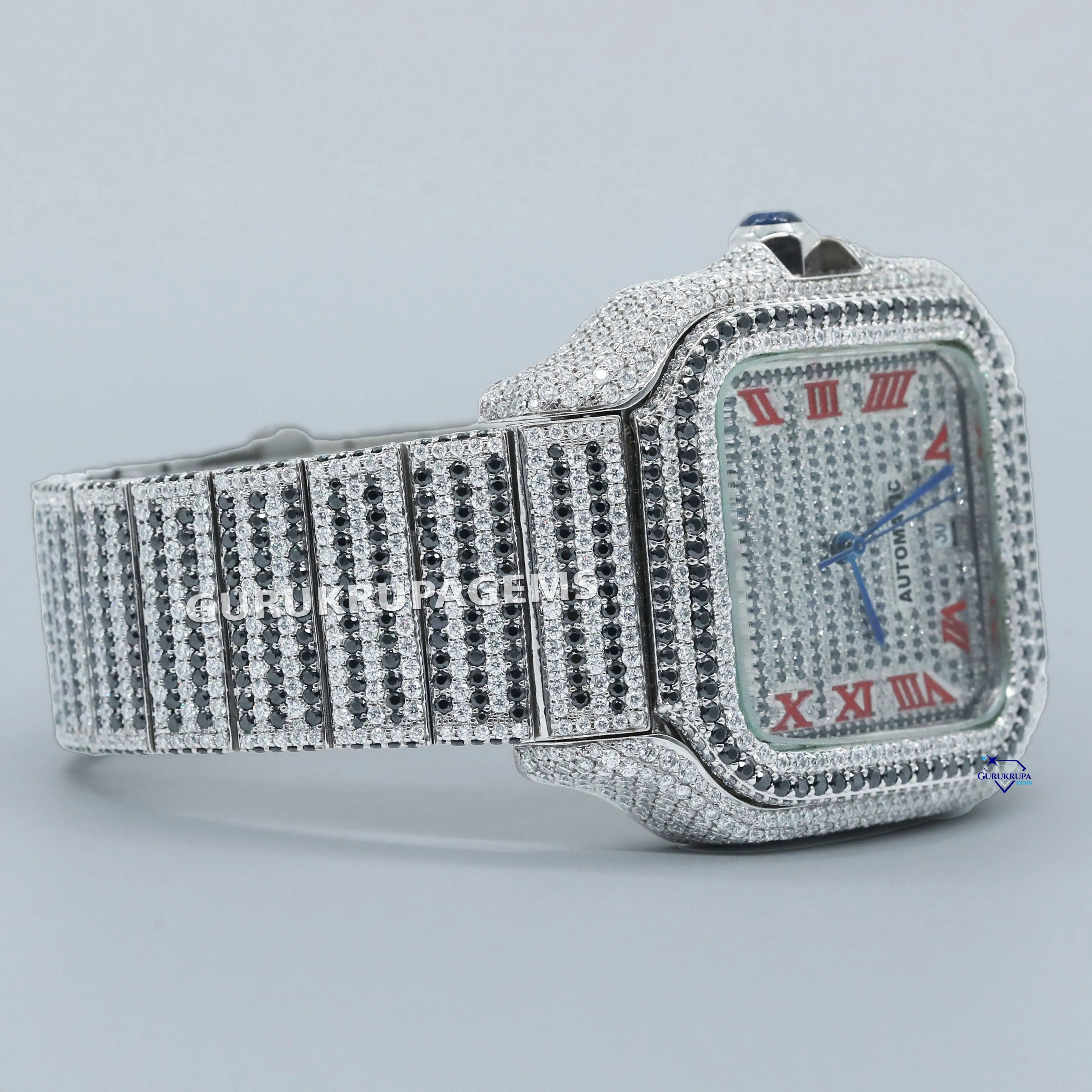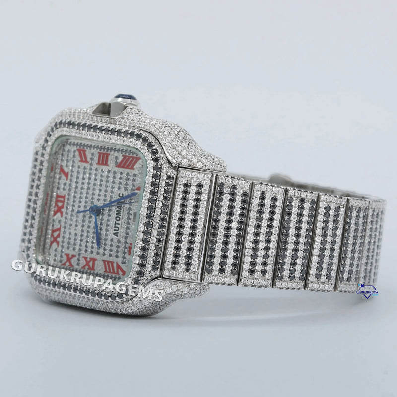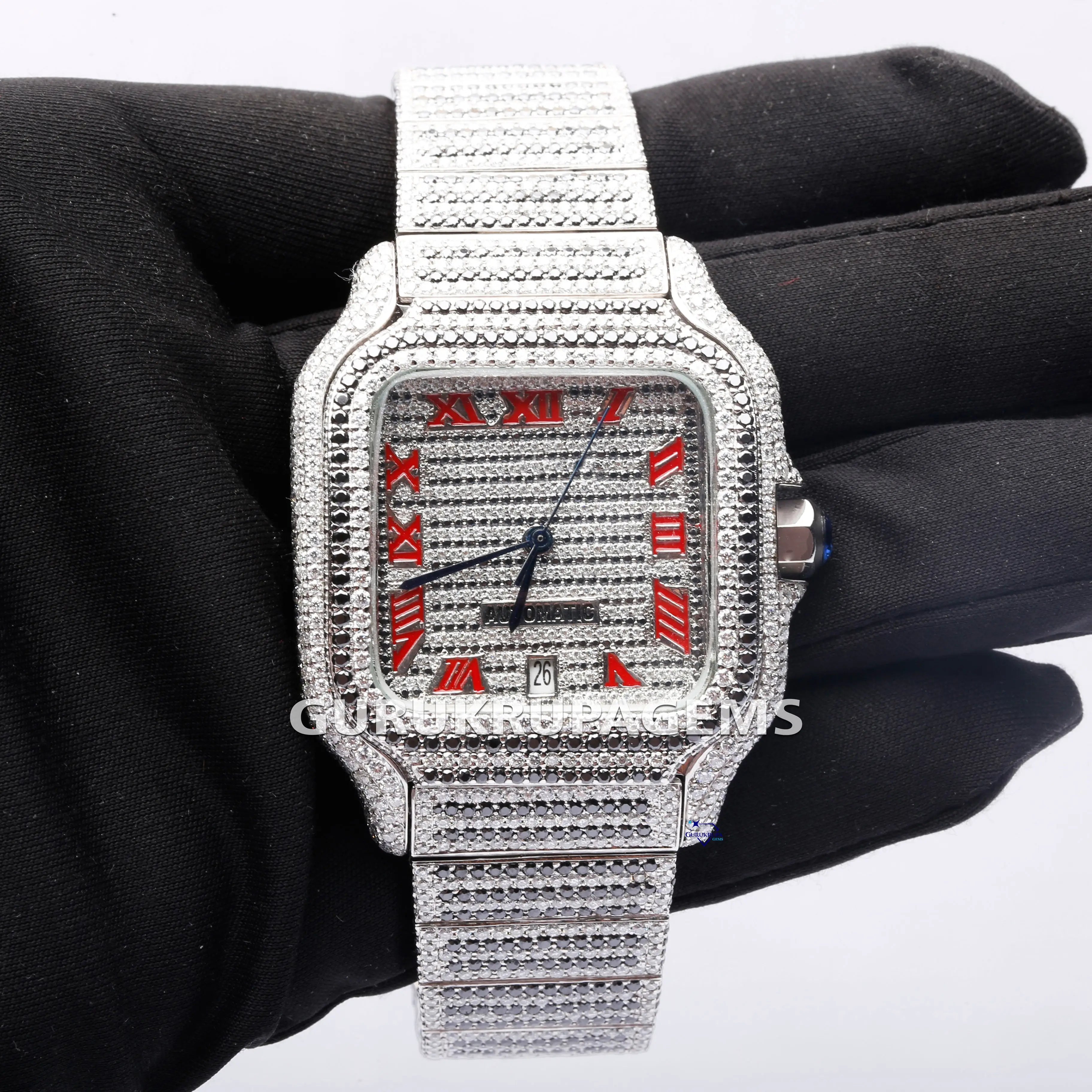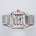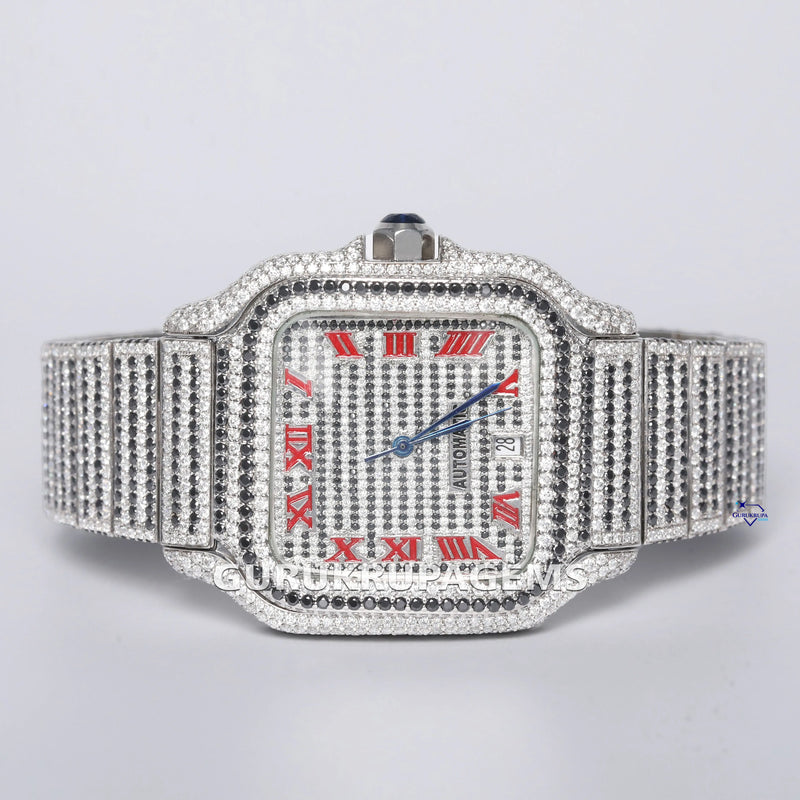Moissanite diamond studded stainless steel watch with red Roman numerals exudes timeless elegance and style