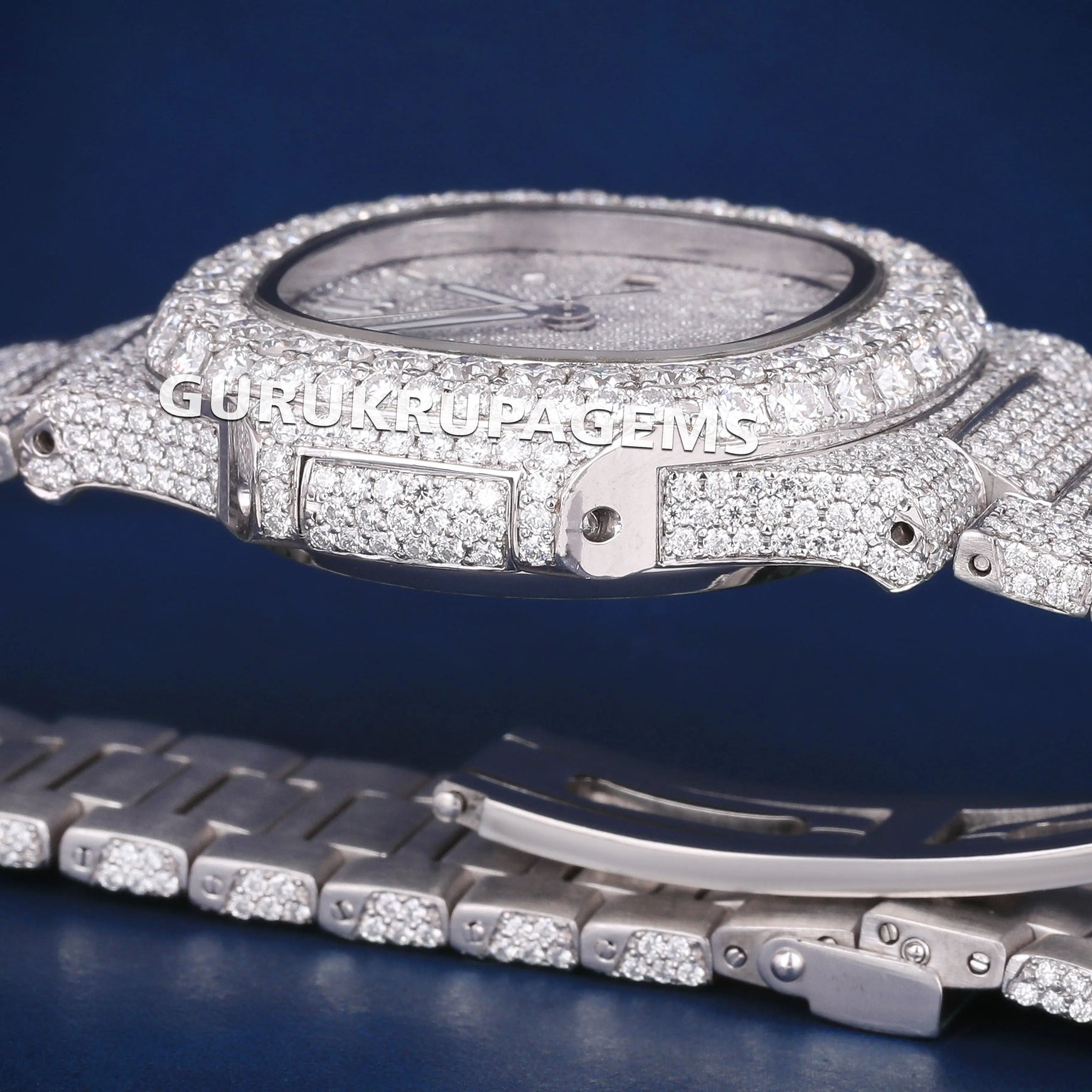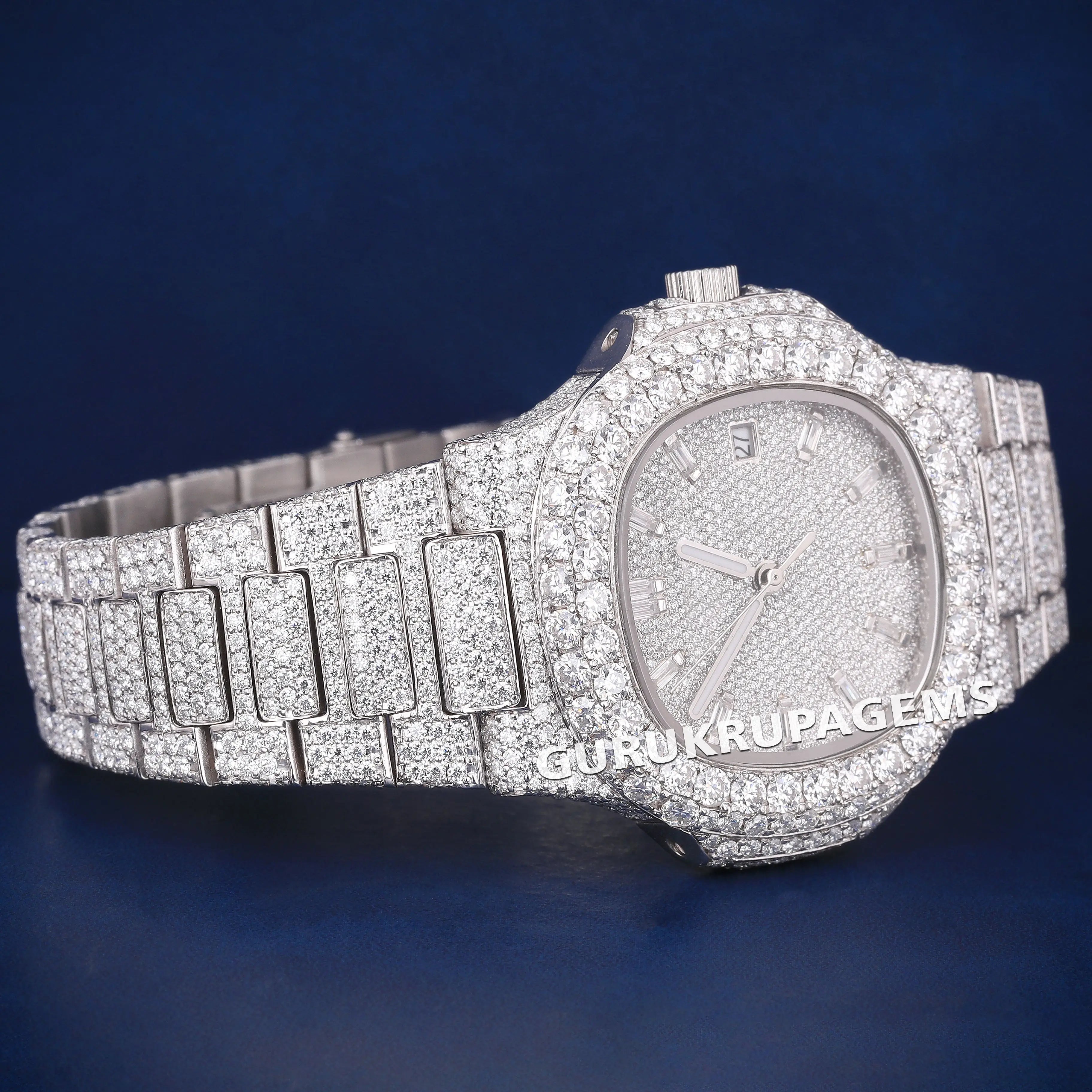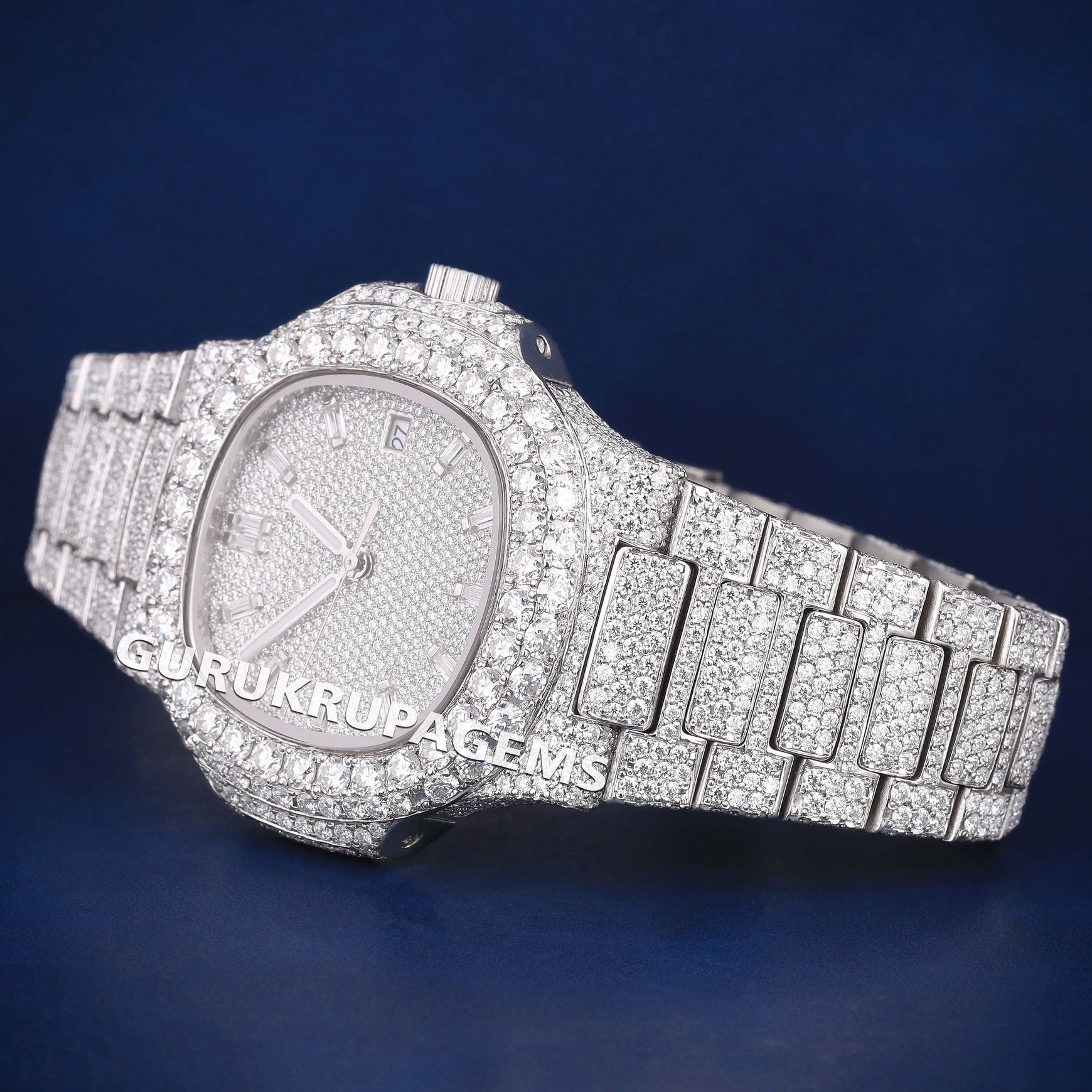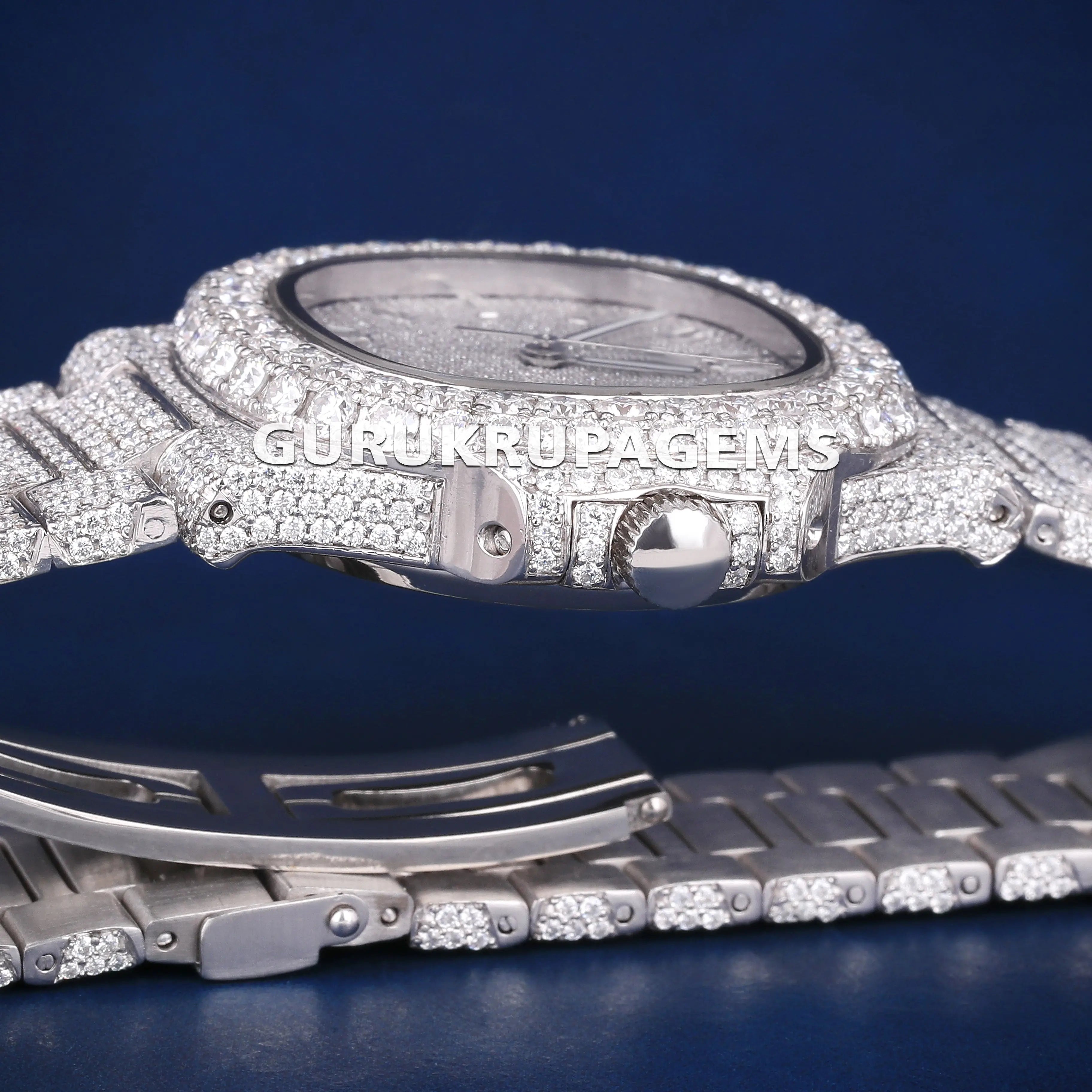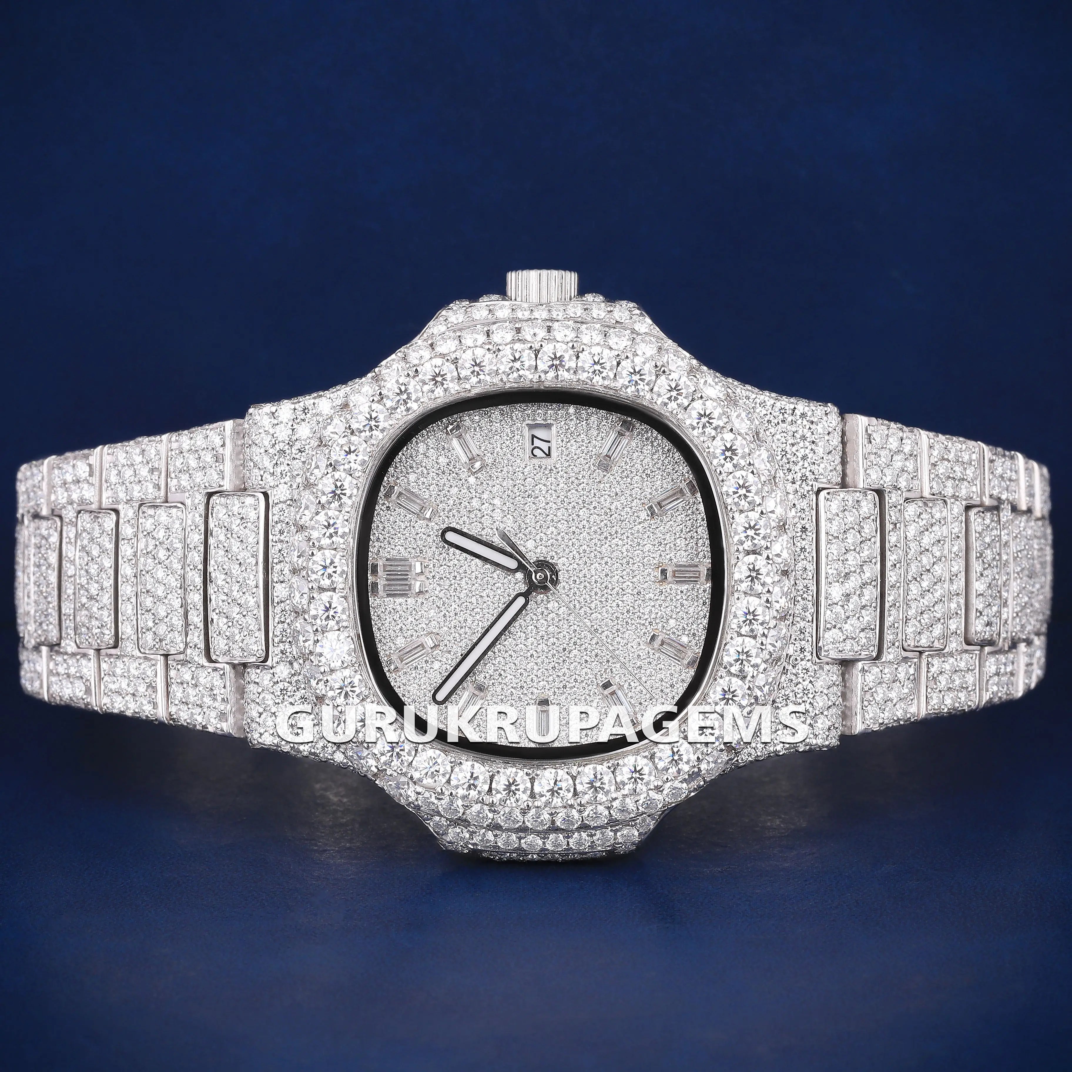 New Custom Watches for Men with Baguette Diamond Numerals Dial Fully Silver Iced Out Watch