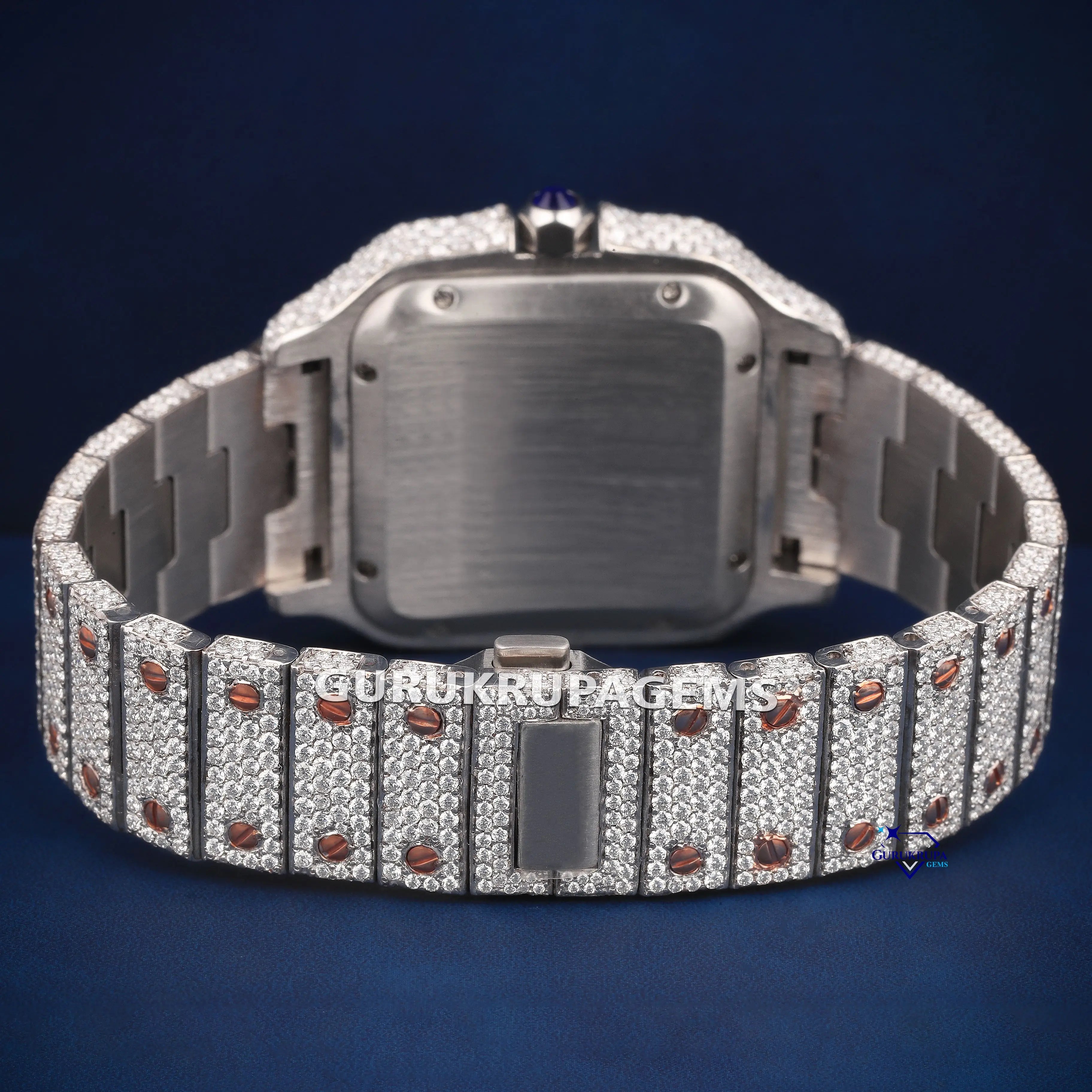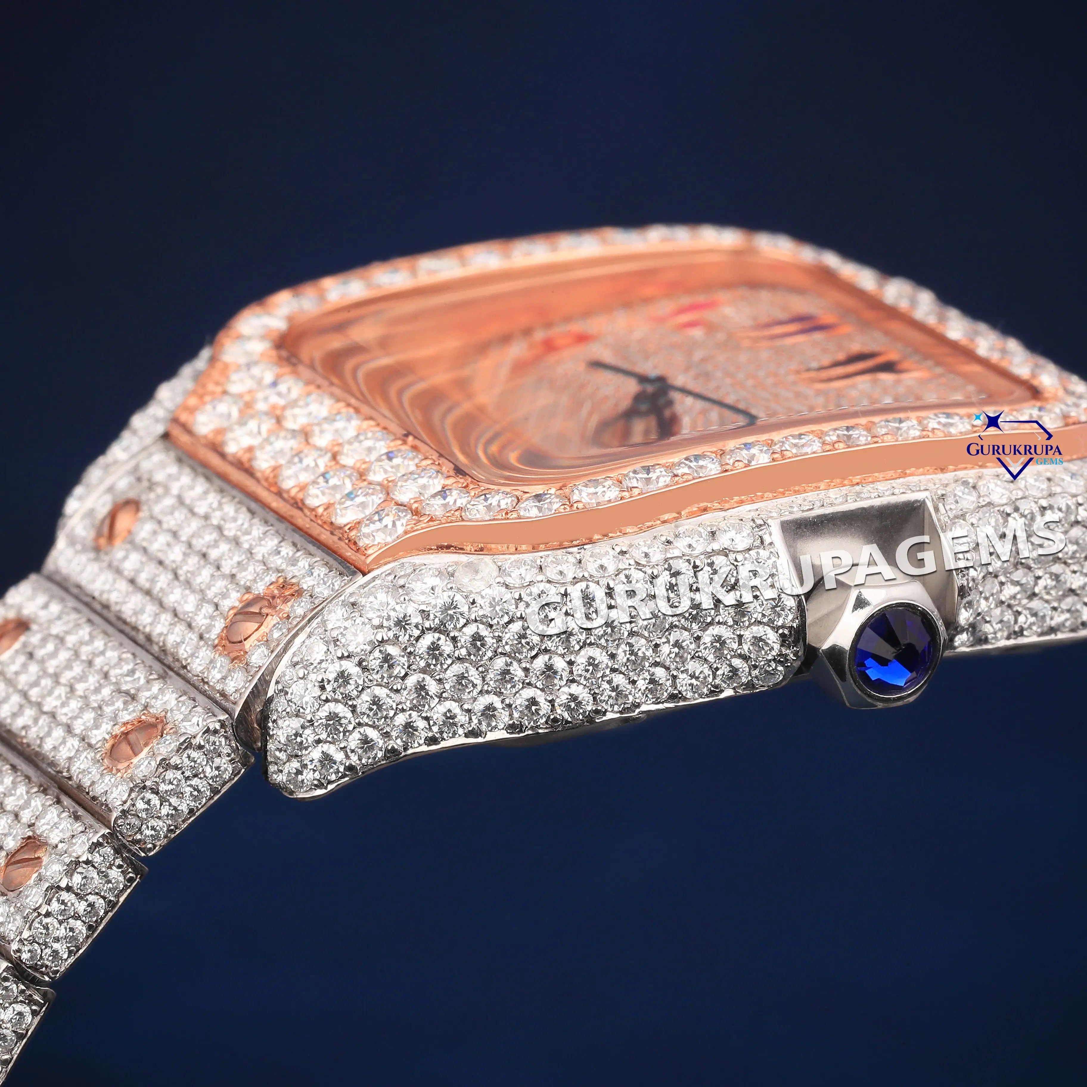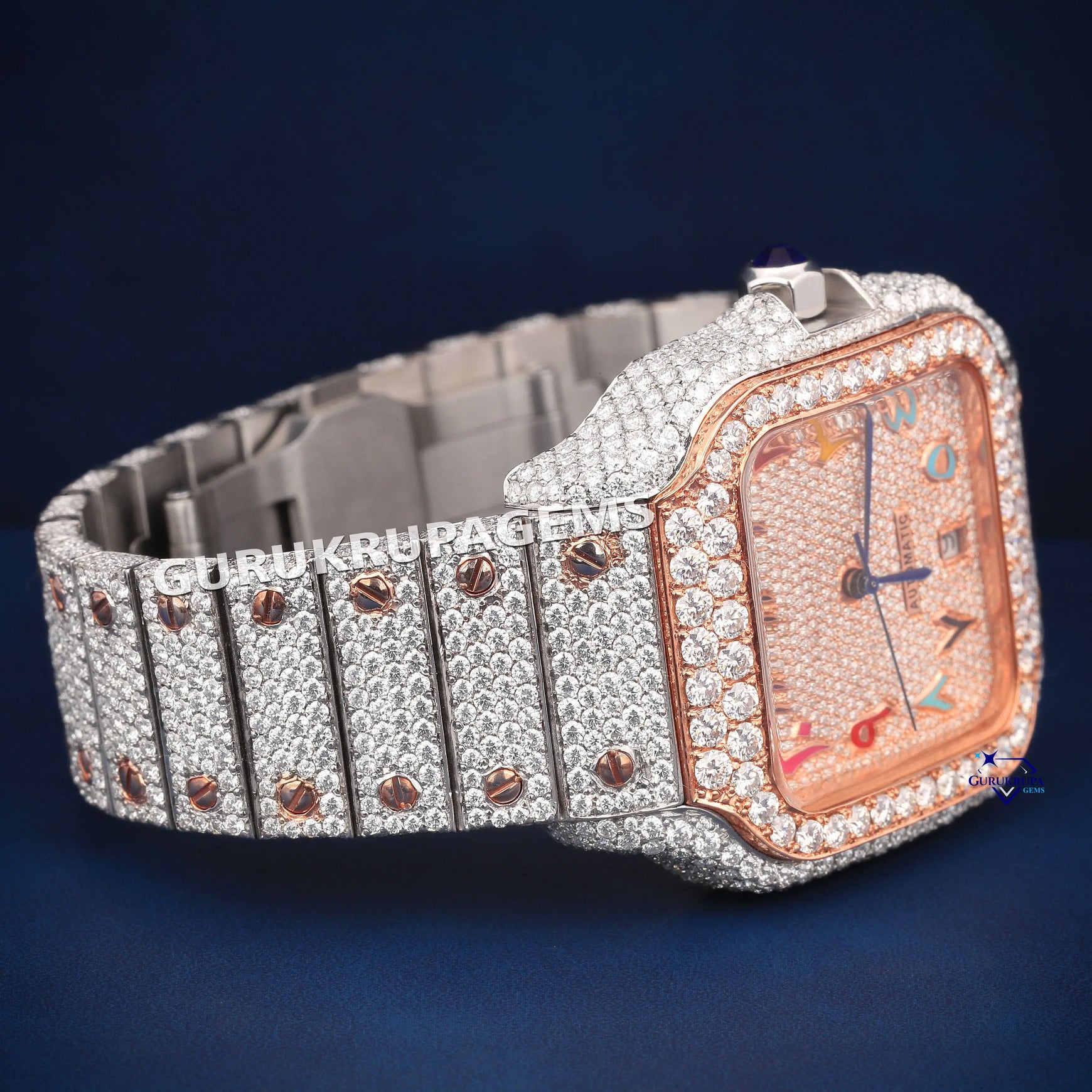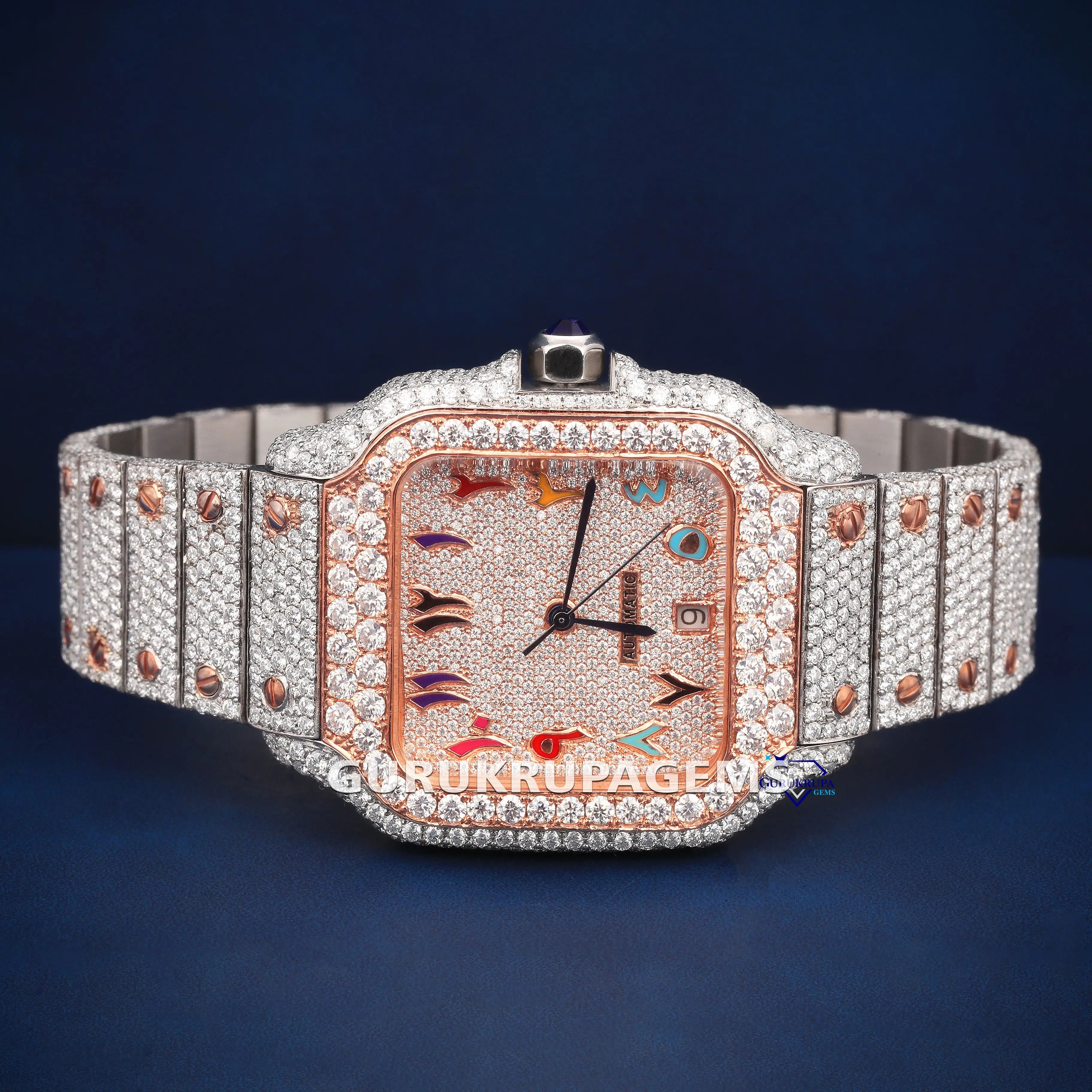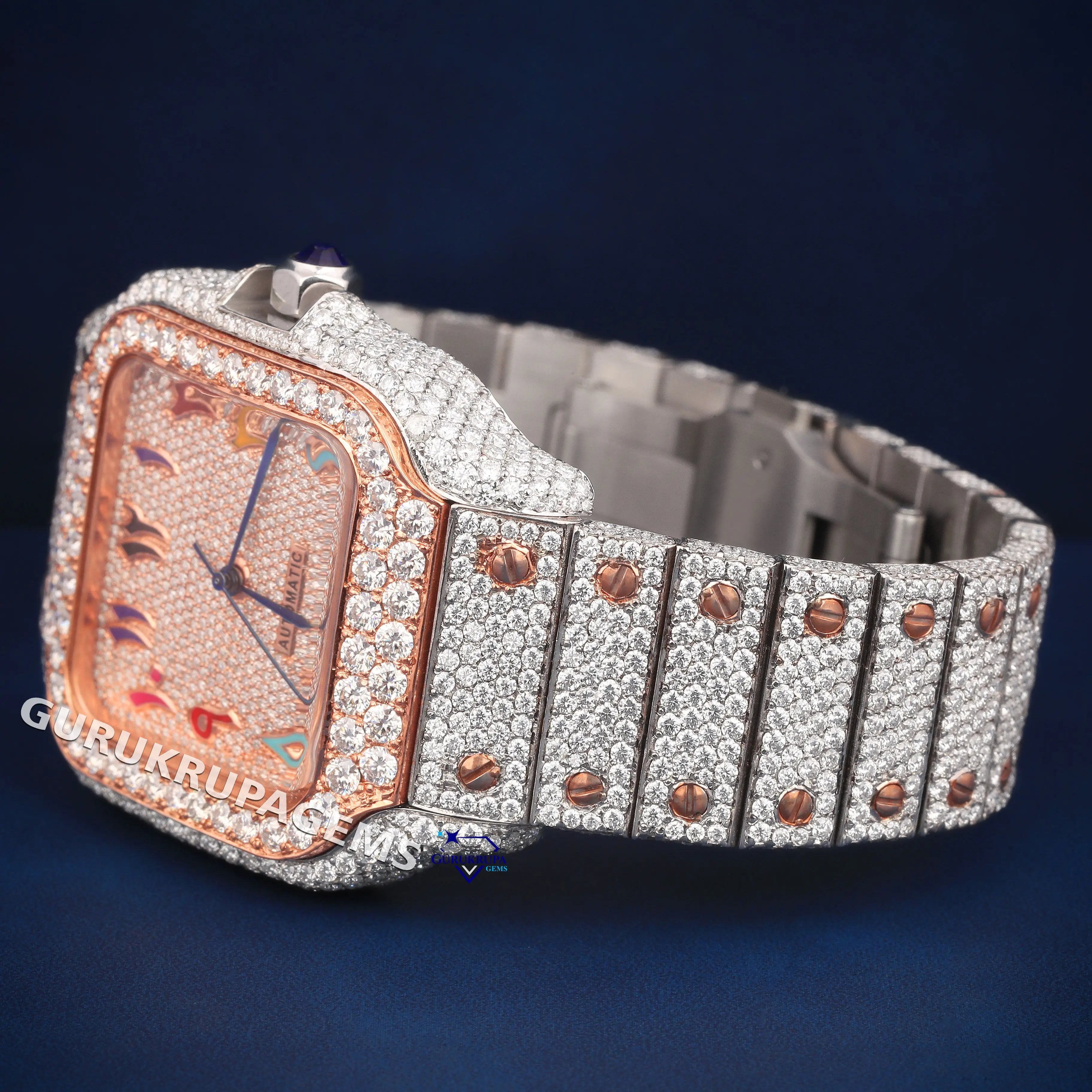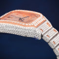 Rose gold moissanite watch fully iced with unique multicolor details for standout style