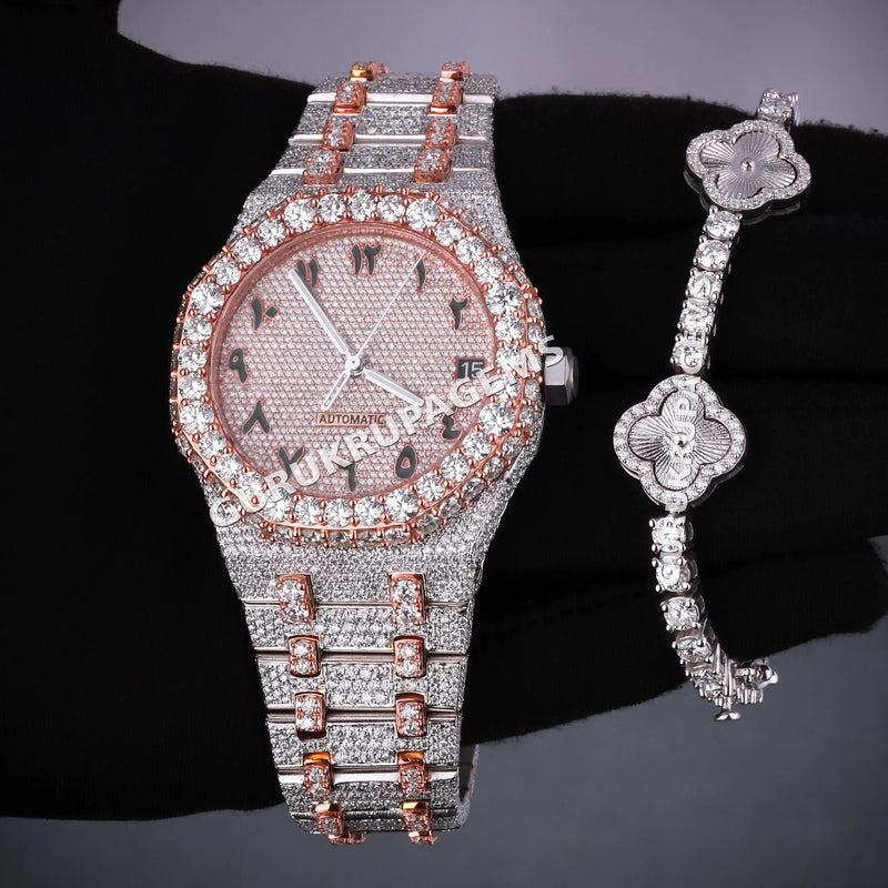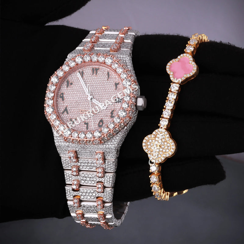 Iced jewelry pairing watch and clover bracelet combo set for luxury style