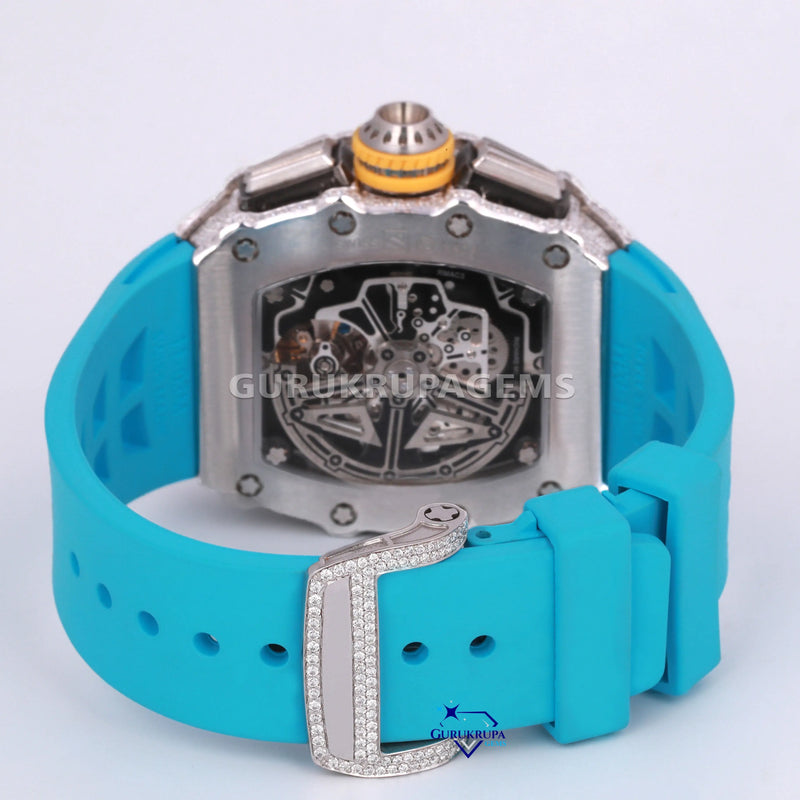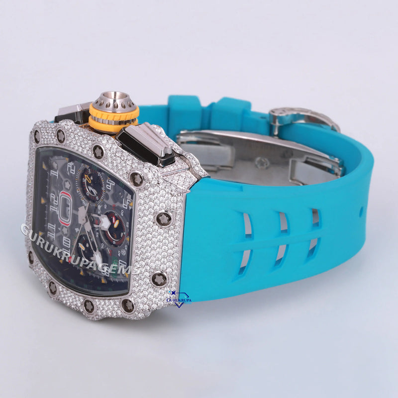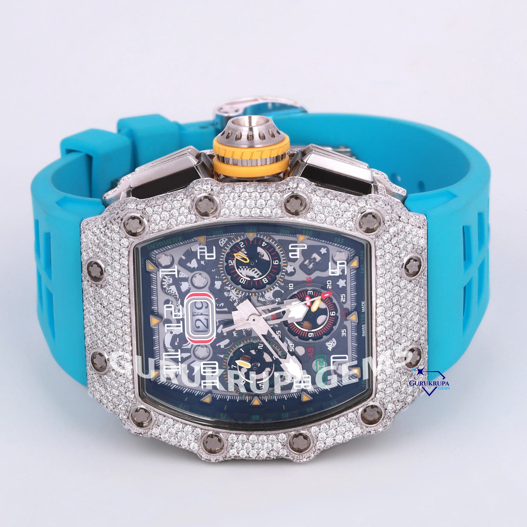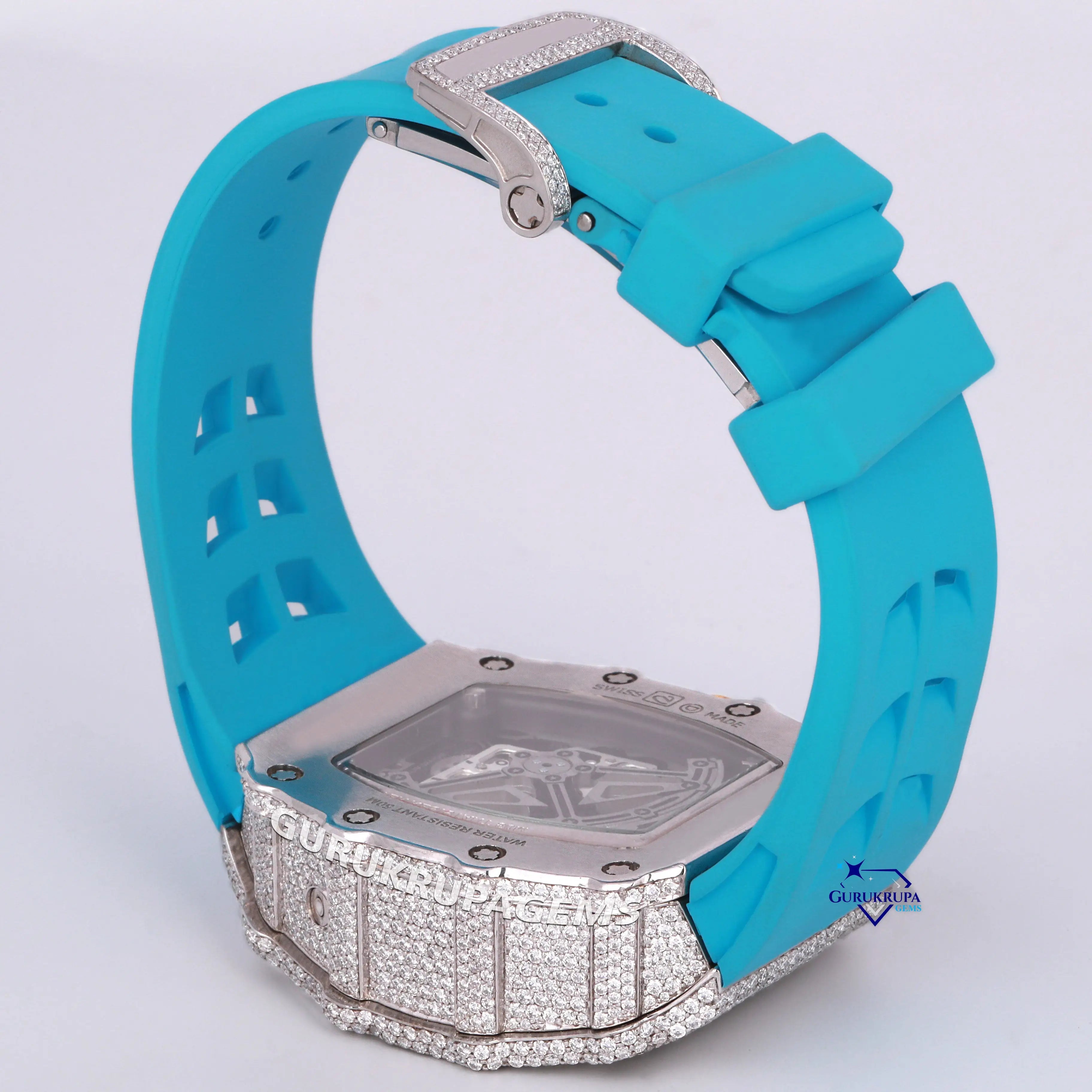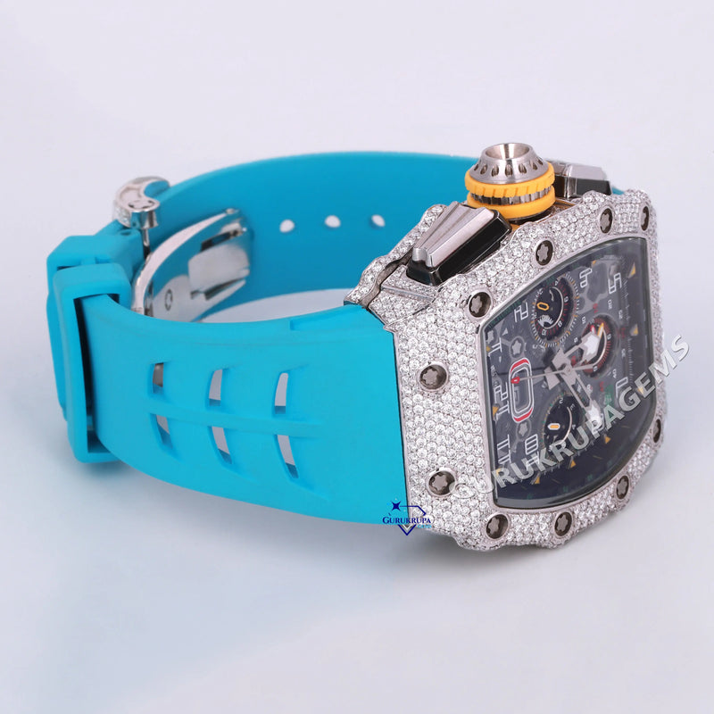 Stylishly crafted this sky blue rubber belt watch stainless steel with vvs clarity lab grown diamonds