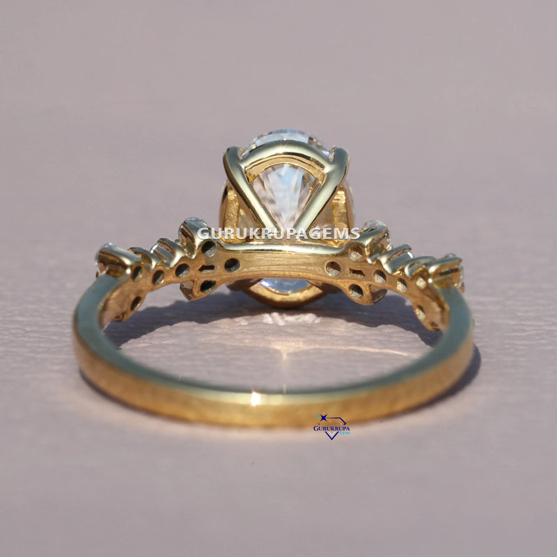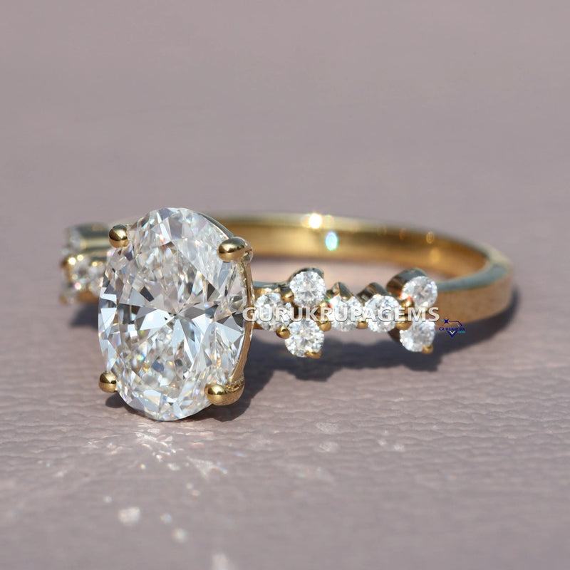Stylishly crafted this unique oval and round cut diamond ring in 14 kt yellow gold lab grown diamonds