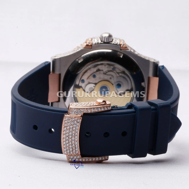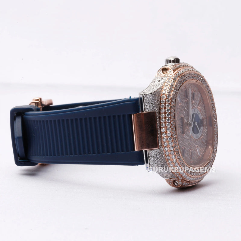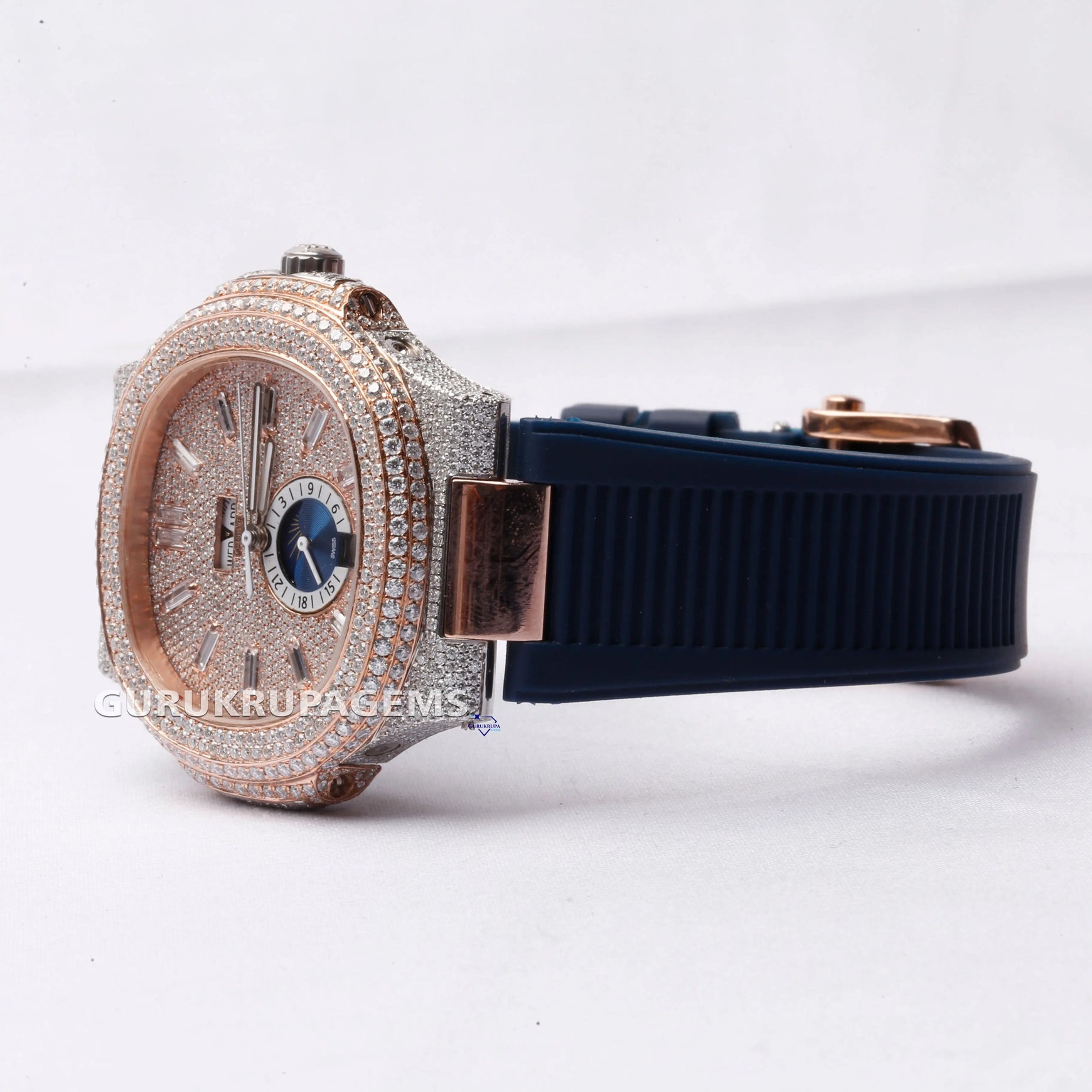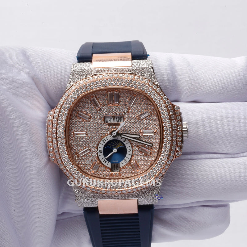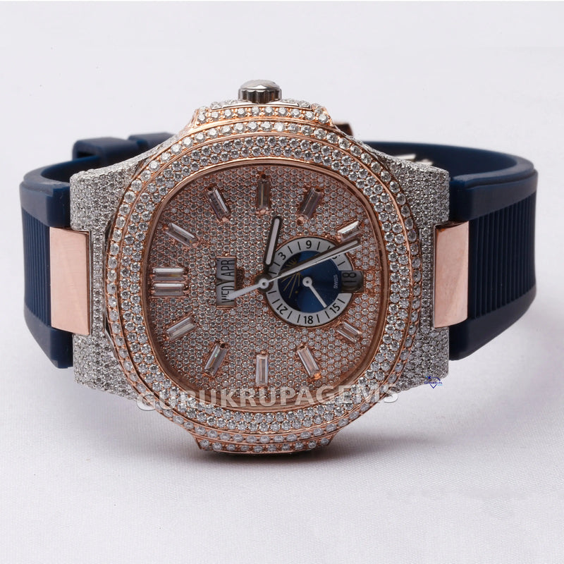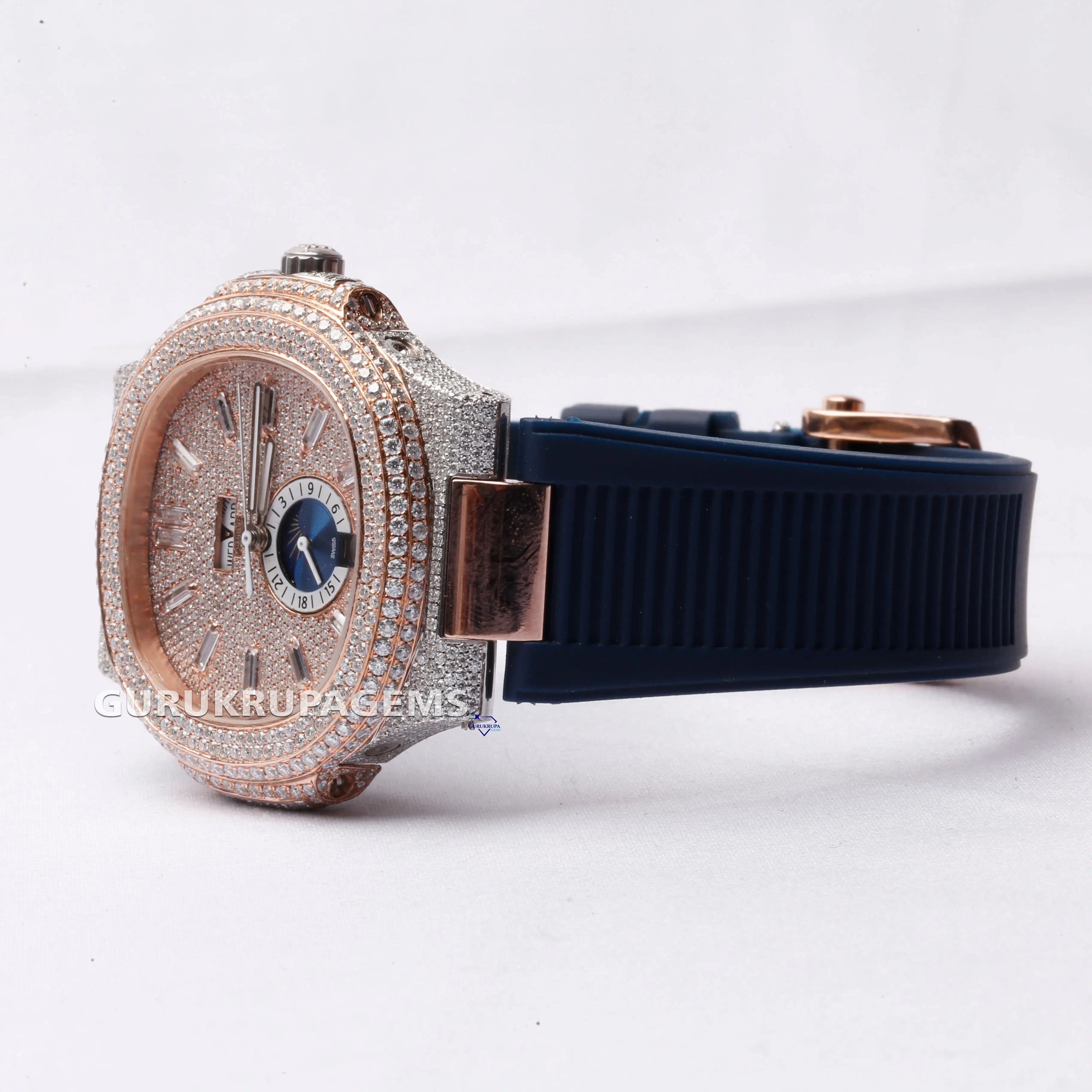 The latest design features a moissanite watch with one dial inside a dial complemented by a rubber strap