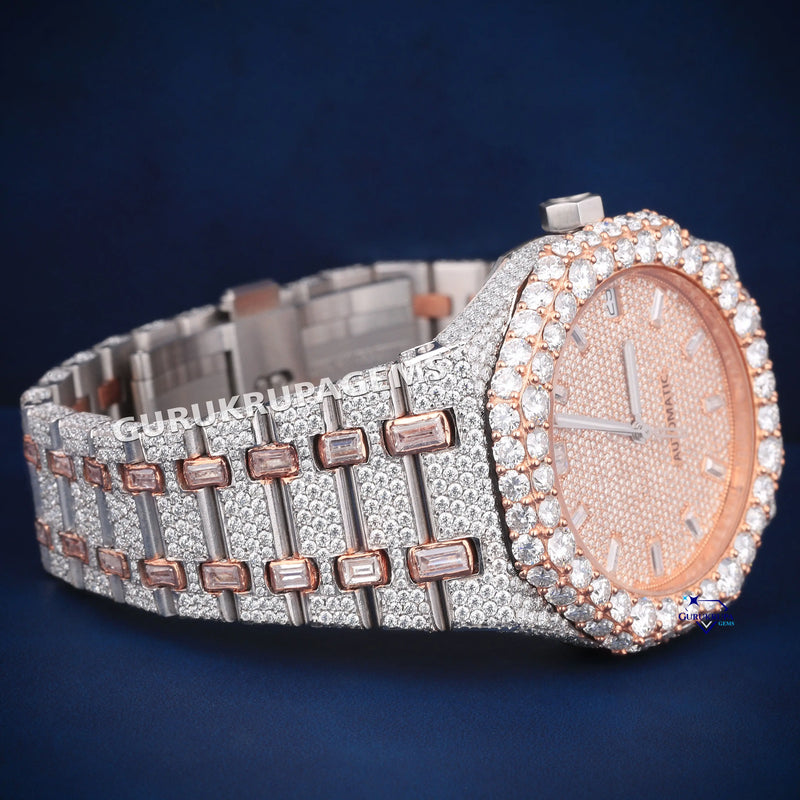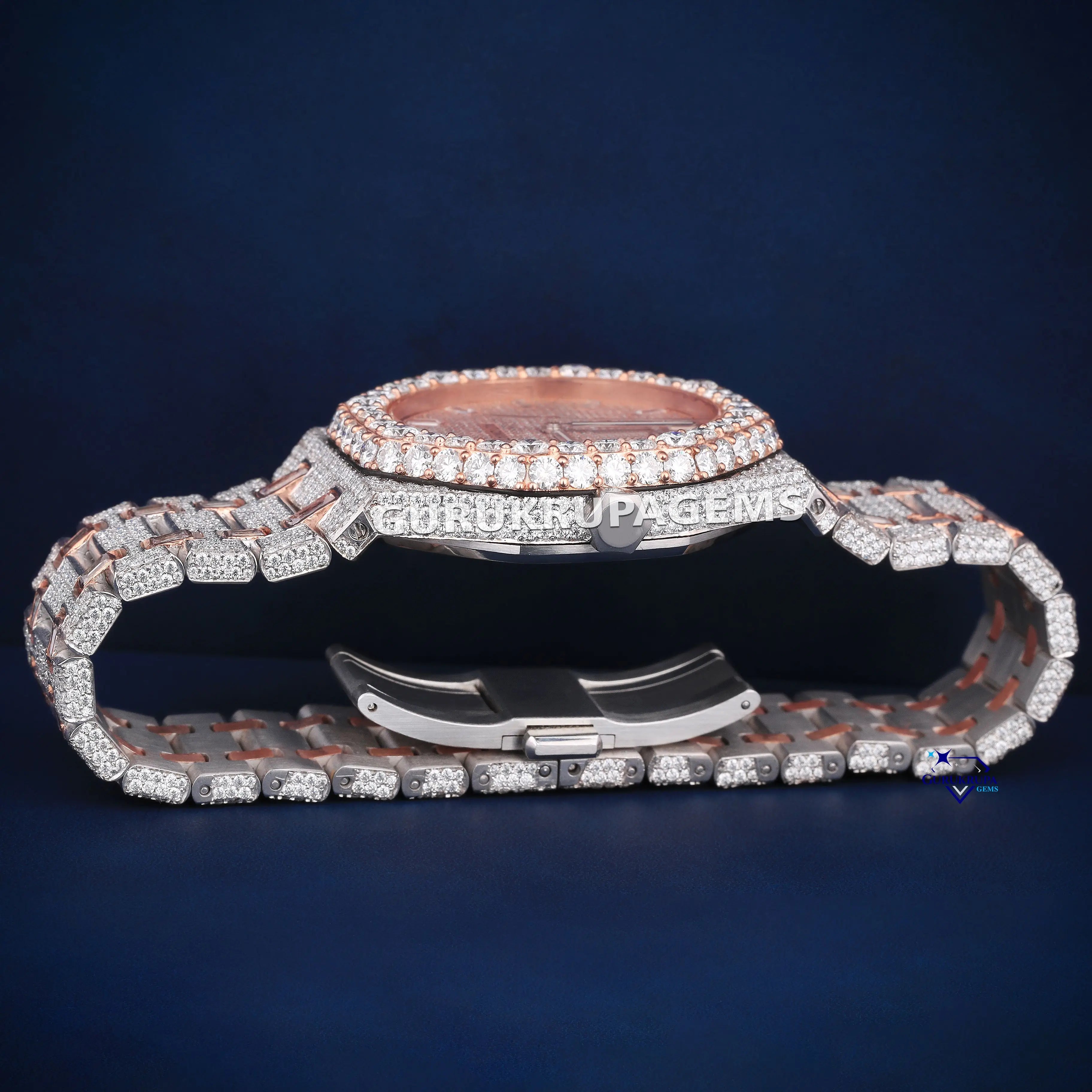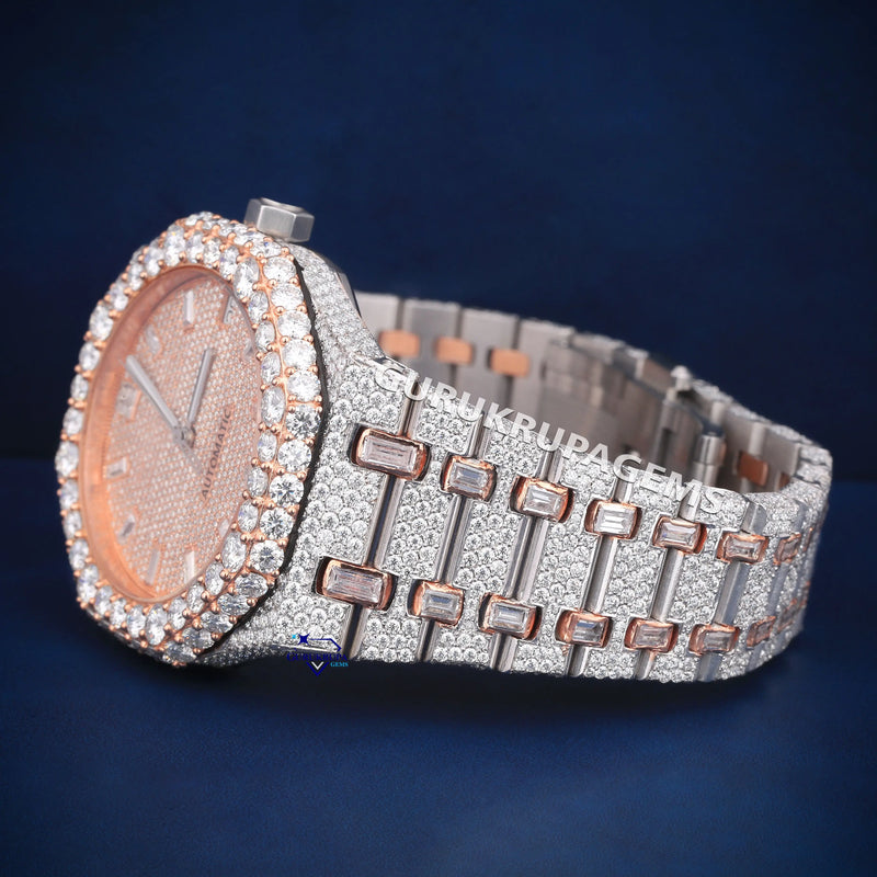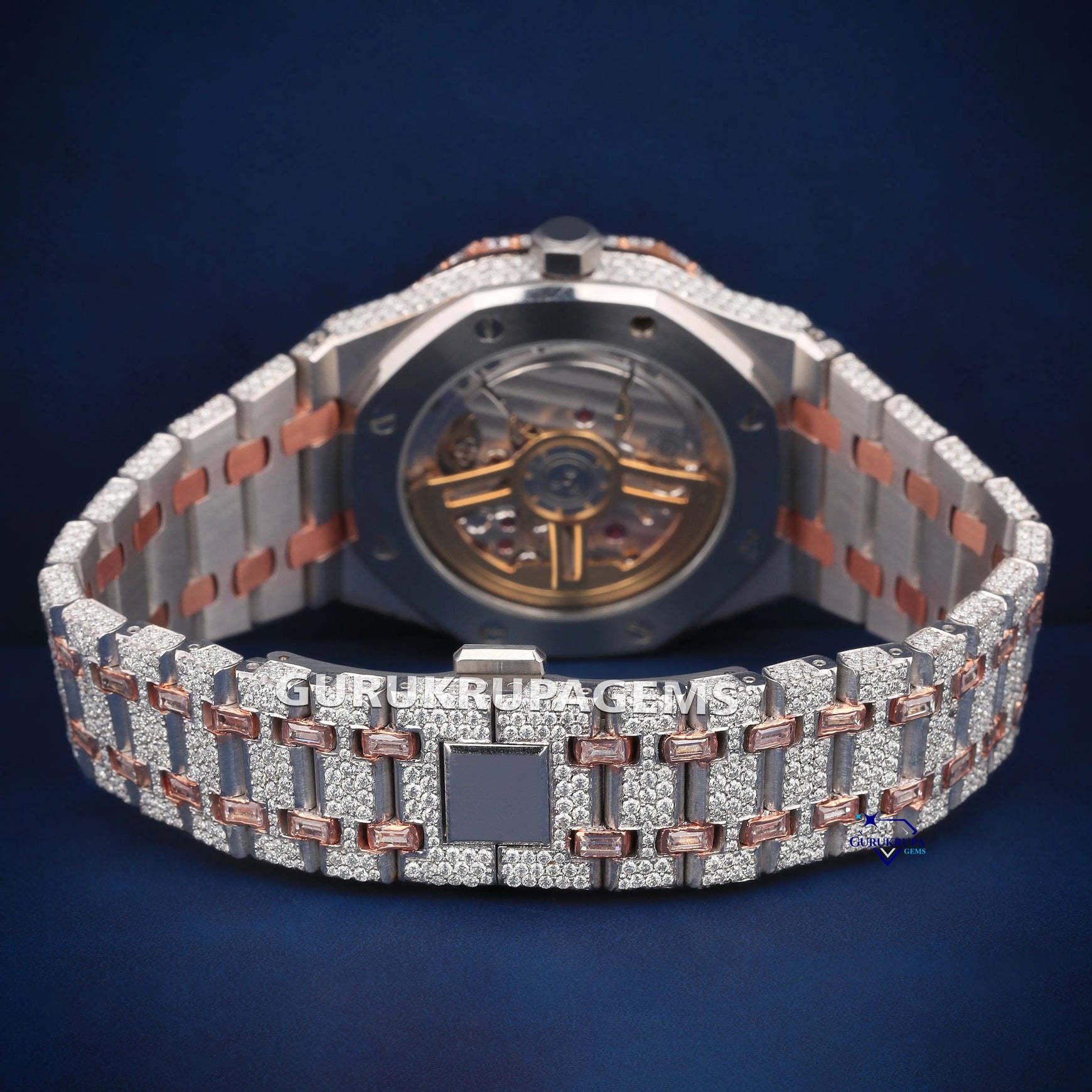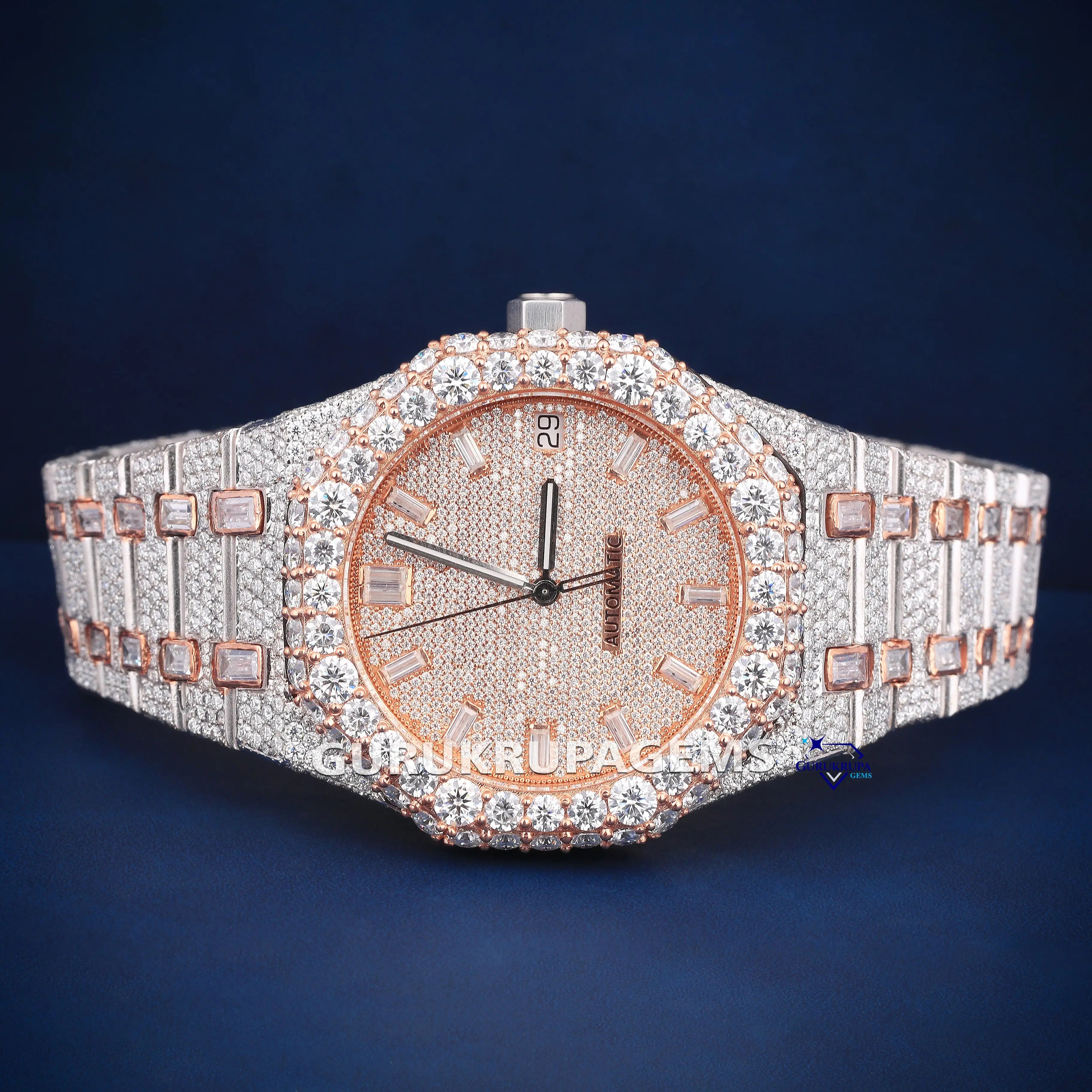 Two Tone Hip Hop Diamond Watch Fully Iced Out Lab Created Round And Baguette Cut Diamond Watch